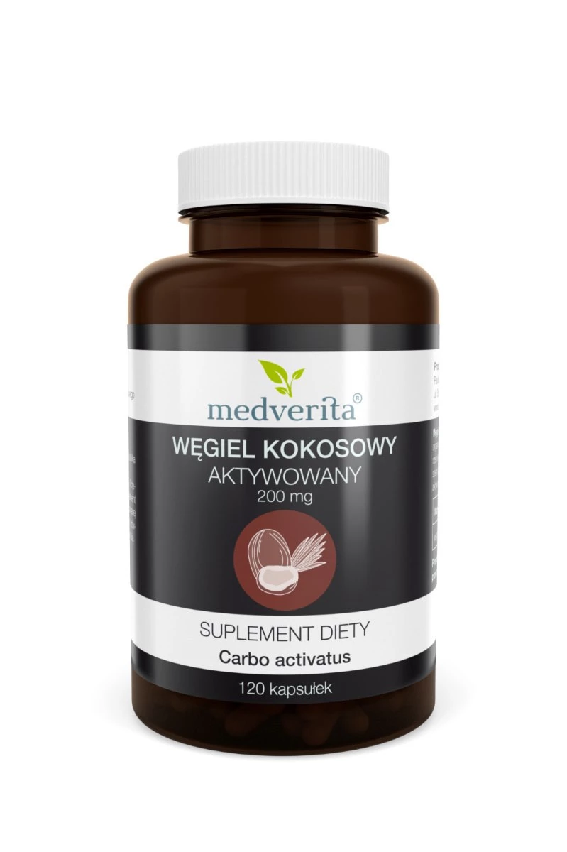 Suplement diety Medverita Węgiel Kokosowy Aktywowany to produkt zawierający węgiel uzyskany z łupin orzecha kokosowego, podany w kapsułkach niezawierających zbędnych dodatków.