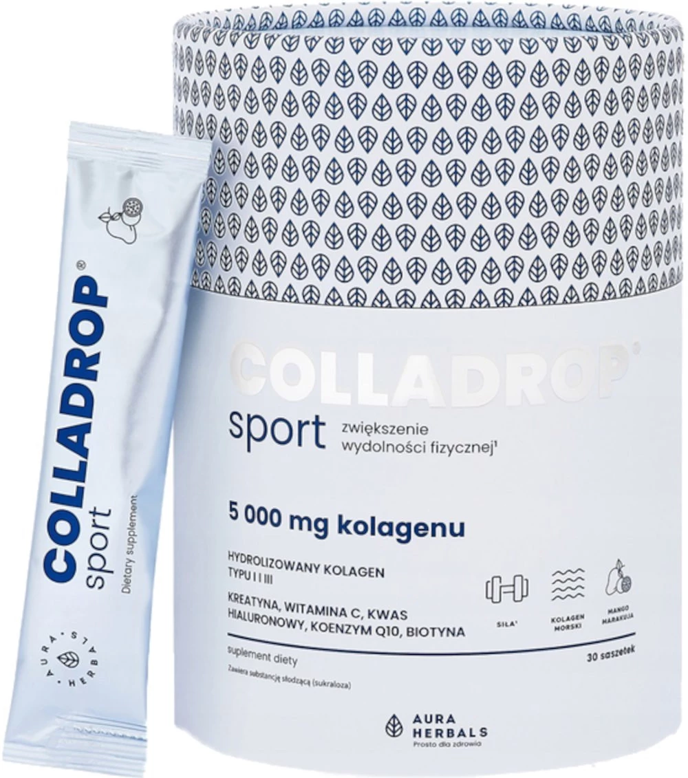 - Colladrop® Sport, kolagen morski 5000 mg, saszetki 30 szt. Zawiera 5000 mg hydrolizowanego kolagenu rybiego typu I i III. Preparat wzbogacony o witaminę C, która przyczynia się do prawidłowego tworzenia kolagenu. Dodatkowo zawiera kreatynę i biotynę.