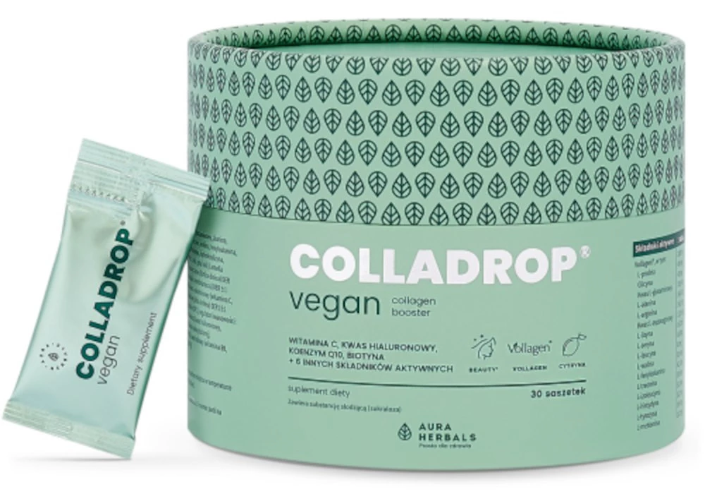 Aura Herbals Colladrop Vegan Collagen Booster Vollagen 2000 mg  to nowoczesny suplement diety w formie saszetek, przeznaczony dla osób poszukujących roślinnej alternatywy dla tradycyjnego kolagenu. Każda saszetka zawiera 2000 mg specjalnie sformułowanego kompleksu roślinnego. Produkt ten jest odpowiedzią na potrzeby wegan i wegetarian, jak również osób preferujących roślinne składniki w swojej diecie.