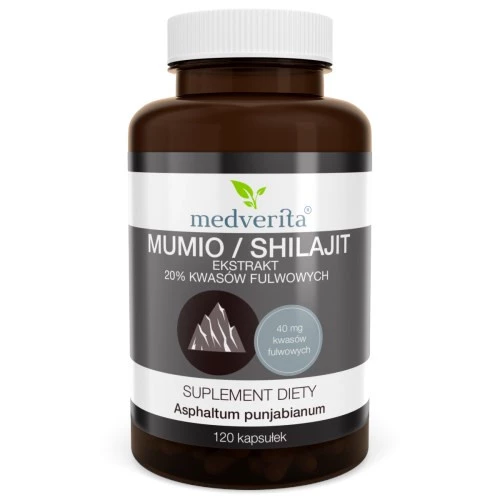 Suplement diety Medverita Mumio/Shilajit 120 kapsułek to produkt o prostym składzie zawierającym ekstrakt z shilajit (Asphaltum punjabianum) standaryzowany na 20% kwasów fulwowych.