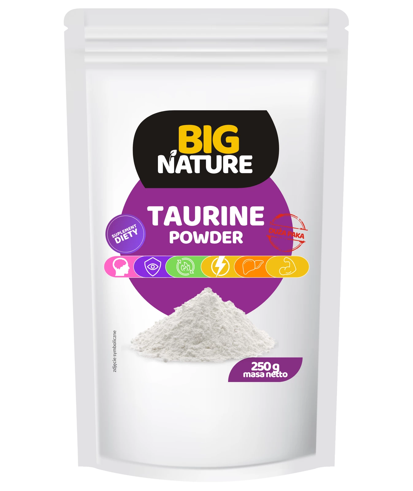 Produkt Big Nature Taurine Powder 250 g BIG NATURE to suplement diety. Nie może być stosowany jako substytut zróżnicowanej diety. Pamiętaj o zrównoważonym sposobie żywienia i zdrowym trybie życia.- Przechowuj w chłodnym miejscu, z dala od bezpośredniego światła słonecznego.