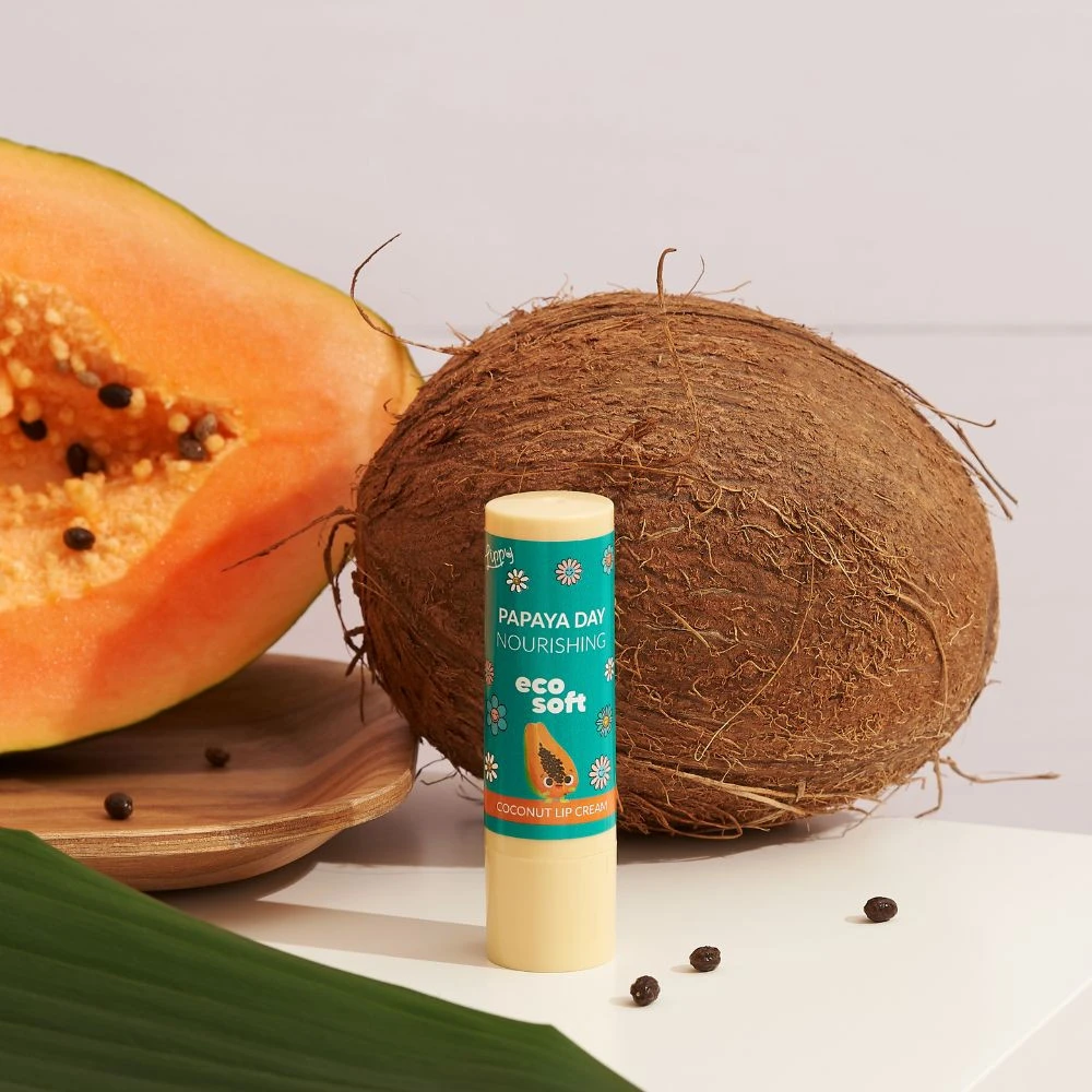 Kokosowy odżywczy balsam do ust z nutą melona i papai.