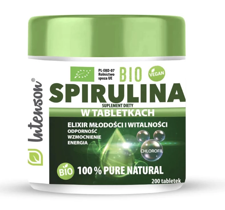 Intenson Bio Spirulina 100% to naturalne bogactwo składników odżywczych, które wesprze zdrowe nawyki żywieniowe. Spirulina to alga uchodząca za doskonałe źródło chlorofilu i innych cennych substancji, które warto uwzględnić w swojej codziennej suplementacji.