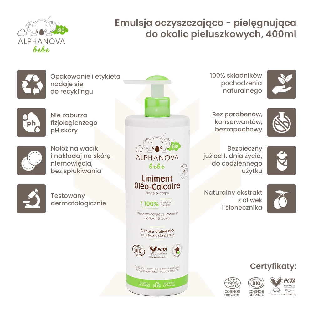 Delikatny Balsam Oliwny dla niemowląt, 400 ml jednym ruchem oczyszcza, nawilża, łagodzi i chroni skórę niemowlęcia od pierwszych dni życia podczas codziennej pielęgnacji. Jego formuła zawiera 100% składników pochodzenia naturalnego, jest bezzapachowa i pozbawiona konserwantów, aby chronić delikatną skórę niemowląt i noworodków. Wykonany na bazie tradycyjnej receptury opartej na unikalnej synergii składników: wody wapiennej i organicznych olejów roślinnych z oliwek i słonecznika. Chroni i łagodzi nawet podrażnioną skórę, również w okolicy pieluszkowej, tworząc ochronną barierę izolującą. Delikatny balsam oliwny Alphanova Bebe Bio to bardzo delikatny, hipoalergiczny, bezzapachowy dermokosmetyk, który pomaga przywrócić fizjologiczne pH skóry. Nie zawiera parabenów i konserwantów. Formuła biodegradowalna i wegańska, produkt certyfikowany BIO, testowany dermatologicznie.
