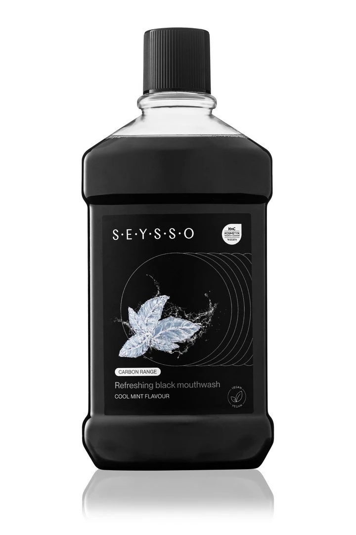 Czarny, intensywnie odświeżający płyn do płukania ust SEYSSO to idealne uzupełnienie kompleksowej pielęgnacji jamy ustnej.