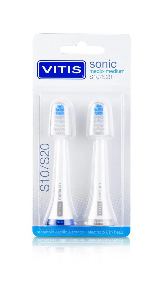 VITIS sonic S10/S20 medium. Zestaw zawiera dwie zapasowe główki szczoteczek o średniej twardości, kompatybilne ze szczoteczkami VITIS sonic S10 i S20.