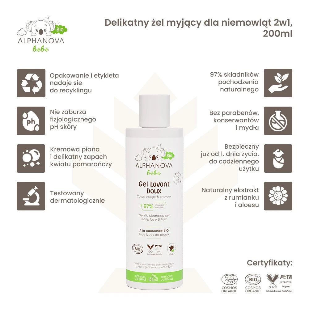 Alphanova Bebe Bio, Delikatny żel myjący dla niemowląt 2 w 1, 200ml