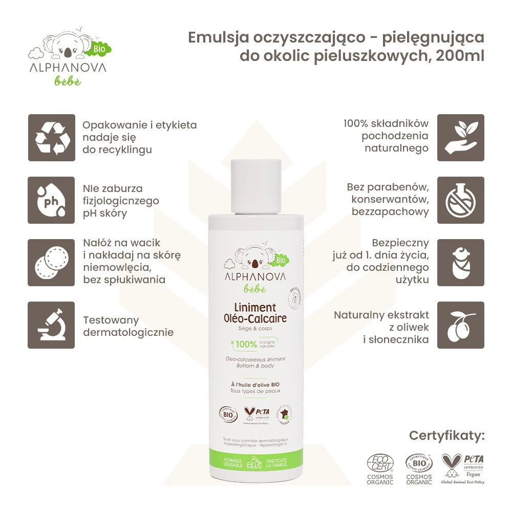 Poznaj bezzapachową emulsję oczyszczającą z kompleksem pielęgnacyjnym do okolic pieluszkowych ALPHANOVA bébé® BIO stworzoną w 100% z naturalnych składników. Dzięki tradycyjnej recepturze z wodą wapienną i organicznymi olejami roślinnymi zabezpiecza skórę maluszka przed podrażnieniami spowodowanymi wilgocią i tarciem pieluszki i tworzy ochronną barierę zabezpieczającą przed czynnikami zewnętrznymi. Hipoalergiczna formuła, bez parabenów i perfum, przywraca naturalne pH skóry i nadaje się do użytku całej rodziny, nawet u osób ze szczególnie wrażliwą skórą.