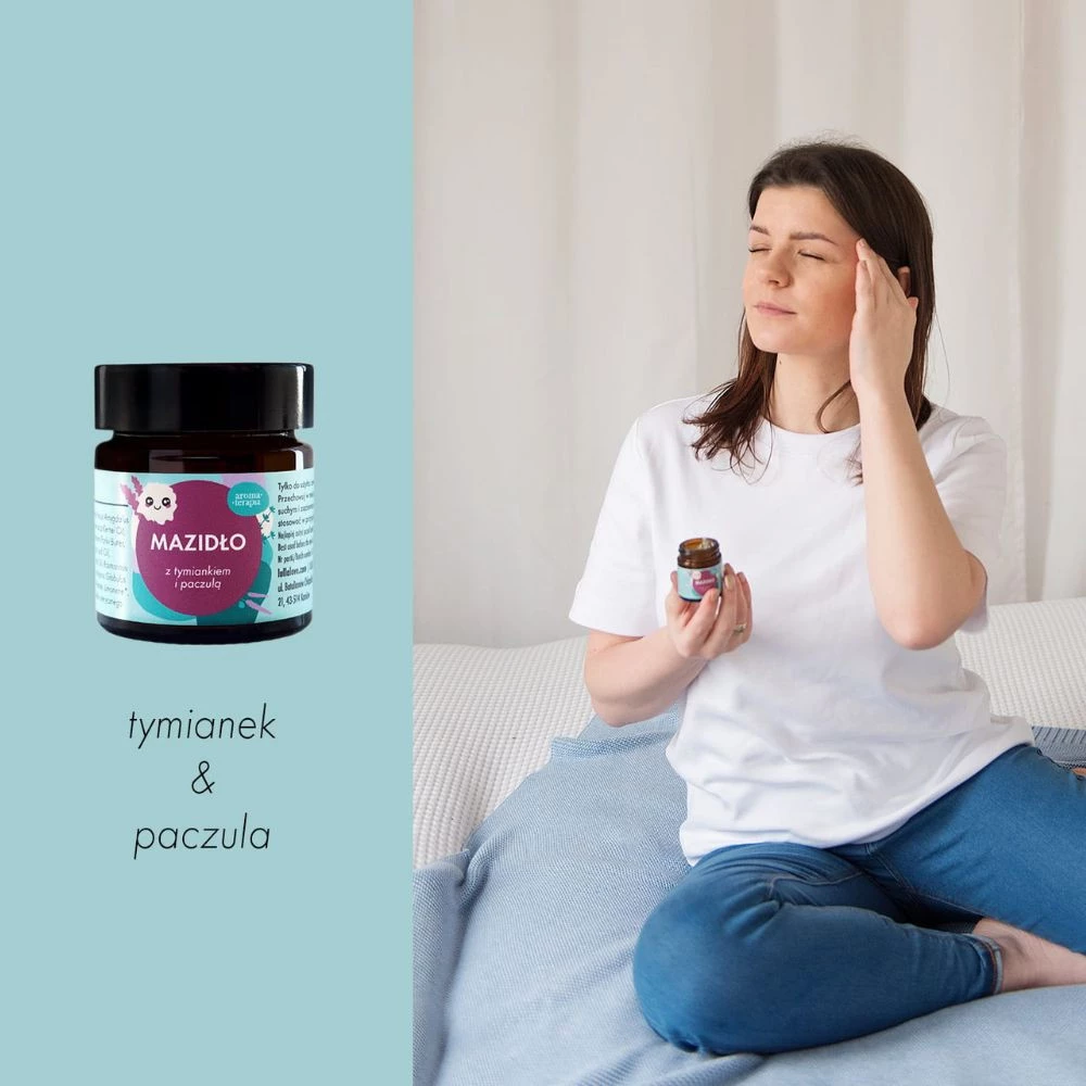 Ciekawostka: mazidłem możesz posmarować wewnętrzną część nadgarstków. Obecny tam olejek z paczuli wykazuje działanie harmonizujące i uspokajające. Mazidło pachnie delikatnie - to nie perfumy ani maść mentholowa, olejki na skórze szybko przestają być wyczuwalne,, bo chodzi w nich przede wszystkim o działanie chemiczne na poziomie przenikania związków z olejków - przez skórę, do krwiobiegu.