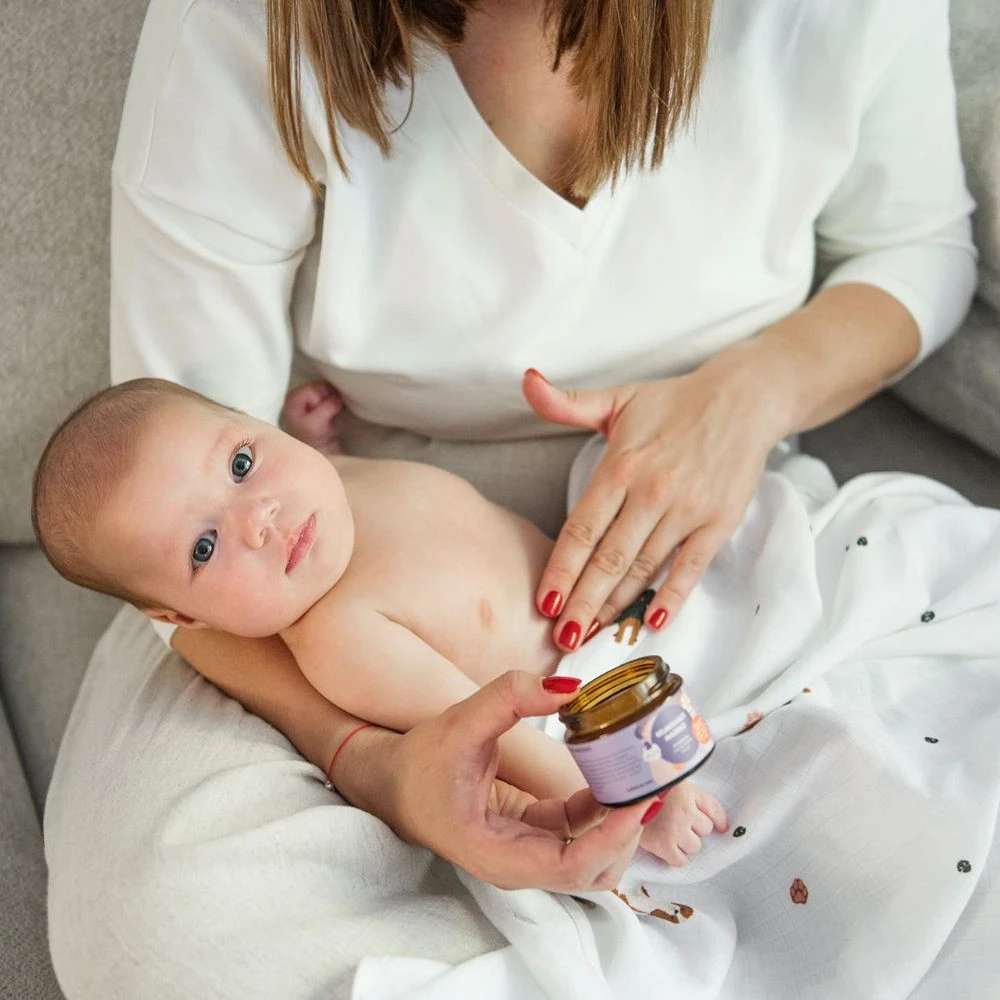 Mazidło do nacierania i masażu skóry z olejkami eterycznymi ze skórki mandarynki, kwiatów lawendy i rumianku. Kojący zapach czystych olejków eterycznych daje ukojenie po intensywnym dnu i podnosi uczucie rozluźnienia. Bezpieczne dla dzieci od 3 miesiąca życia, kobiet w ciąży i karmiących piersią.