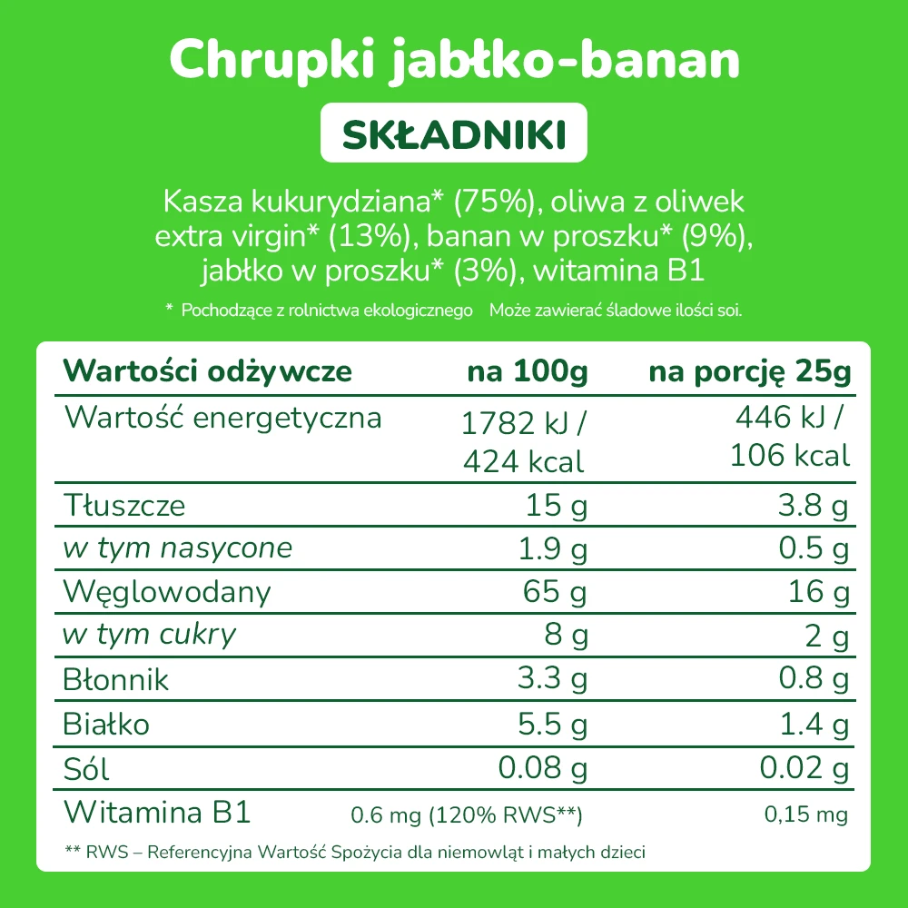 Skład: mąka kukurydziana* (75%), oliwa z oliwek najwyższej jakości z pierwszego tłoczenia* (13%), proszek bananowy* (9%), proszek jabłkowy*(3%), witamina B1