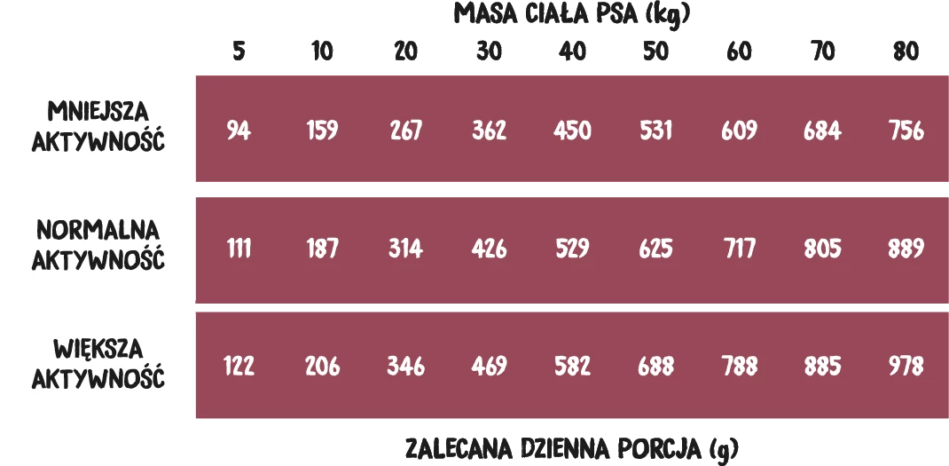 Dzienna dawka zależy od poziomu aktywności i kondycji psa. Obserwuj swojego pupila, dostosowując dawkę w razie potrzeby. Zapewnij stały dostęp do świeżej wody.