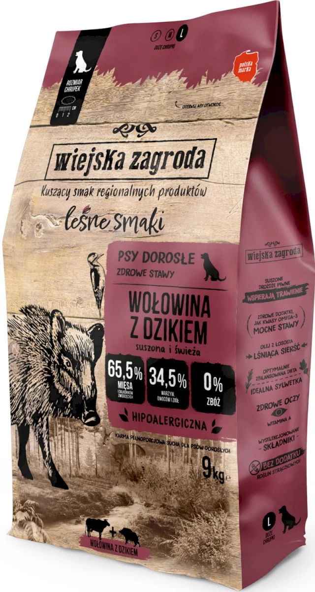 Słowa kluczowe: karma sucha dla psa, karma bezzbożowa dla psa, wołowina z dzikiem dla psa, karma hipoalergiczna, karma dla dorosłych psów, zdrowe stawy psa, Wiejska Zagroda