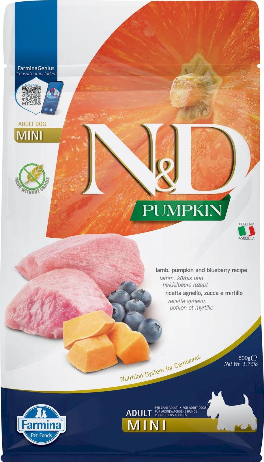 Farmina N&D GF Pumpkin Lamb & Blueberry Adult Mini – sucha karma dla dorosłych psów małych ras 800 g
