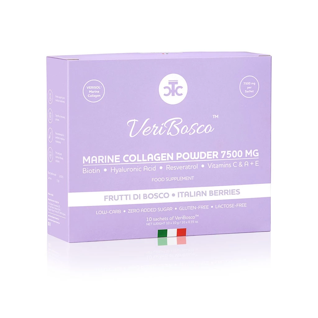 VeriBosco to innowacyjny suplement diety zawierający aż 7500 mg kolagenu morskiego Verisol® w jednej saszetce, wzbogacony o witaminy A, C, E, biotynę, kwas hialuronowy i resweratrol. Idealny dla osób dbających o młody wygląd skóry, włosów i paznokci.