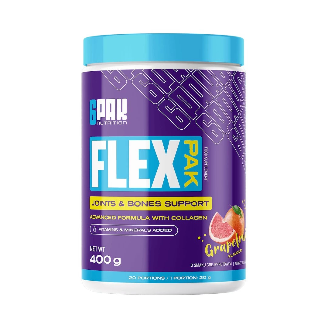 - 6PAK FLEX PAK 400g to produkt, który wspiera kondycję układu ruchu, stawy oraz kości. Jego kompleksowa formuła dostarcza składników, które mają znaczenie dla regeneracji i ochrony struktur w organizmie.