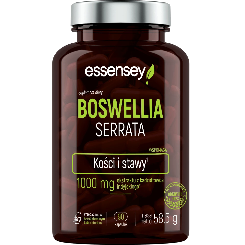 Produkt ESSENSEY BOSWELLIA SERRATA 90cap ESSENSEY to suplement diety. Nie może być stosowany jako substytut zróżnicowanej diety. Pamiętaj o zrównoważonym sposobie żywienia i zdrowym trybie życia.- Przechowuj w chłodnym miejscu, z dala od bezpośredniego światła słonecznego.