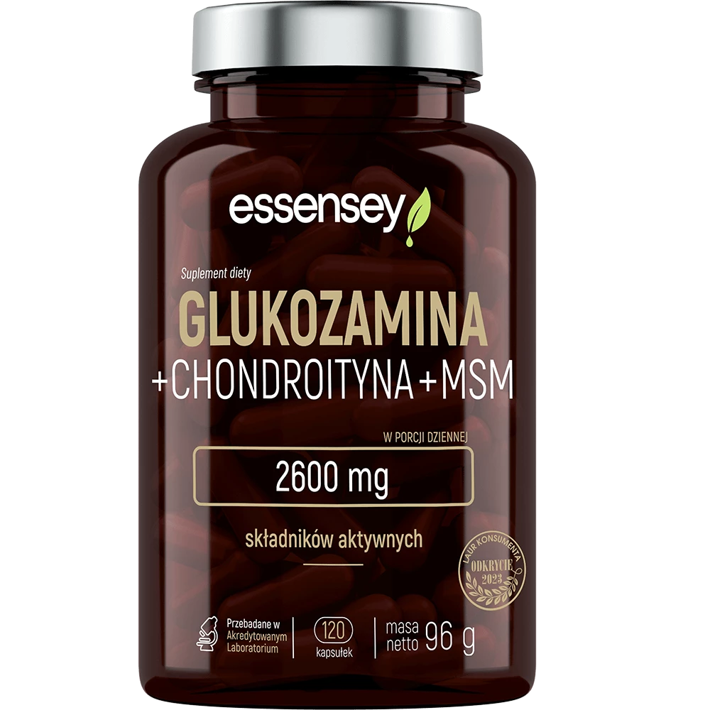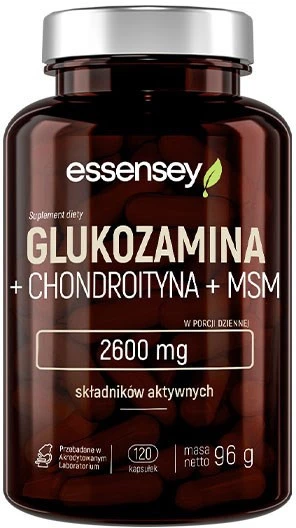 - Essensey Glukozamina + Chondroityna + MSM to produkt, który dostarcza naturalnego siarczanu glukozaminy, siarczanu chondroityny oraz metylosulfonylometanu.
