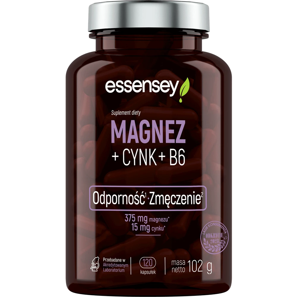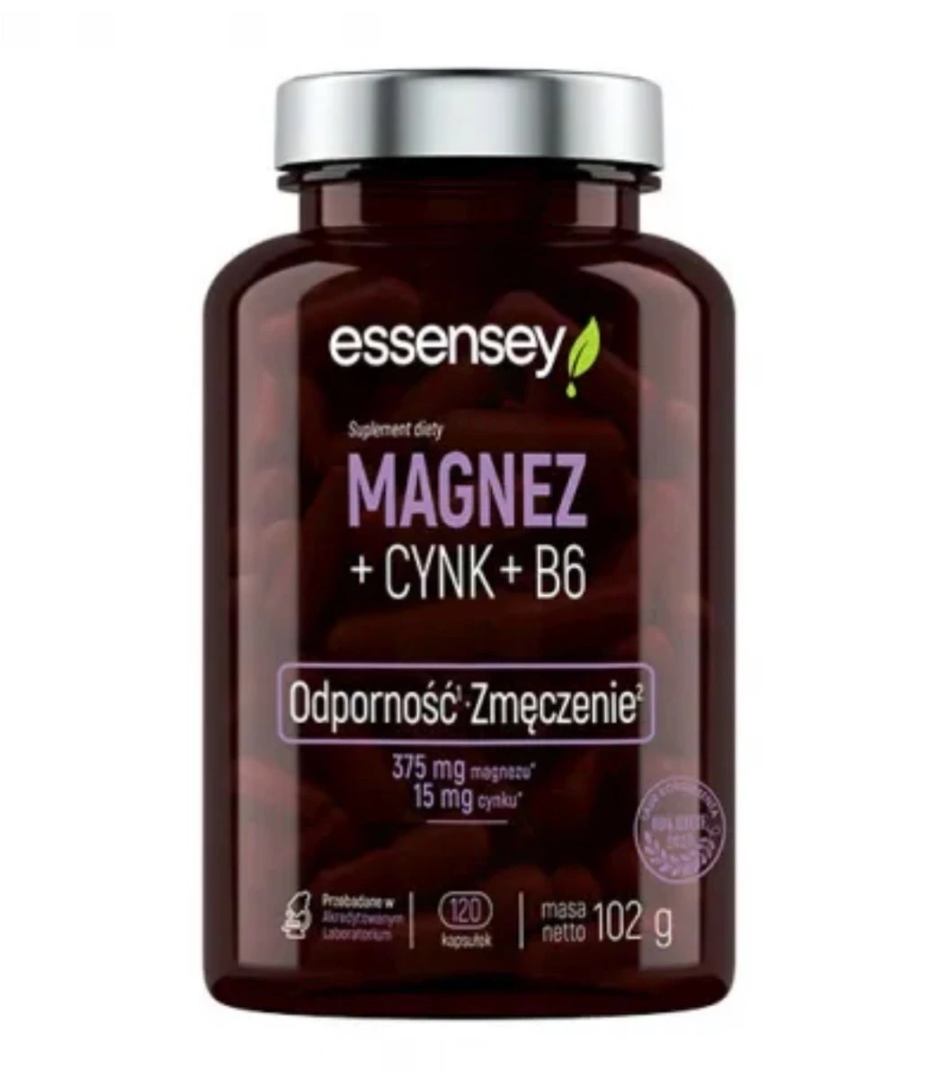 - Suplement diety ESSENSEY MAGNEZ + CYNK + B6 COMPLEX zawiera magnez, cynk i witaminę B6, które wspierają prawidłowe funkcjonowanie organizmu. Magnez i witamina B6 pomagają w zmniejszeniu uczucia zmęczenia.