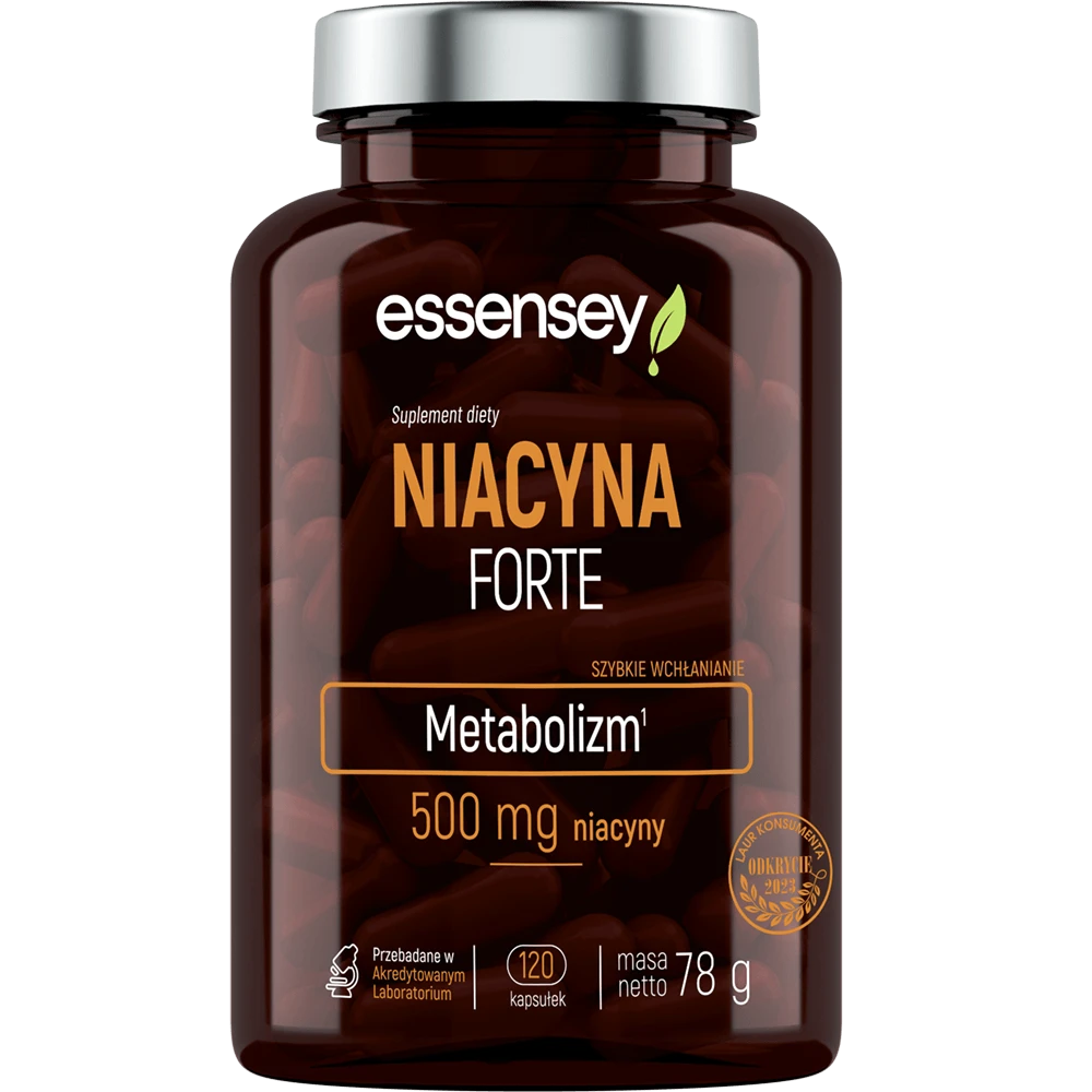 - ESSENSEY Niacyna Forte to suplement diety, który wspiera zdrowie skóry, układu nerwowego oraz metabolizm energetyczny. Dzięki wysokiej dawce niacyny w jednej kapsułce jest to idealny wybór dla osób dbających o swoje zdrowie i witalność.