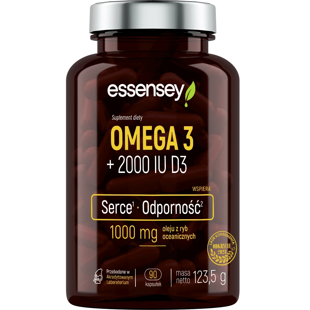 - Suplement diety ESSENSEY Omega 3 + D3 zawiera kwasy tłuszczowe EPA i DHA, które przyczyniają się do prawidłowego funkcjonowania serca, mózgu oraz wzroku. Produkt zawiera 1000 mg oleju rybiego oraz 2000 IU witaminy D3, która wspiera układ odpornościowy.