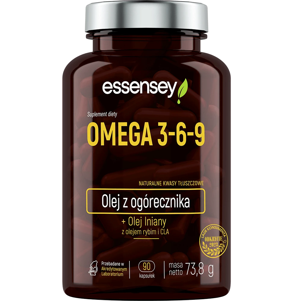 - Suplement diety ESSENSEY Omega 3-6-9 zawiera połączenie wielonienasyconych kwasów tłuszczowych EPA i DHA (omega-3) oraz kwasów tłuszczowych omega-6 i omega-9. Produkt zawiera także witaminę E, która wykazuje działanie antyoksydacyjne.