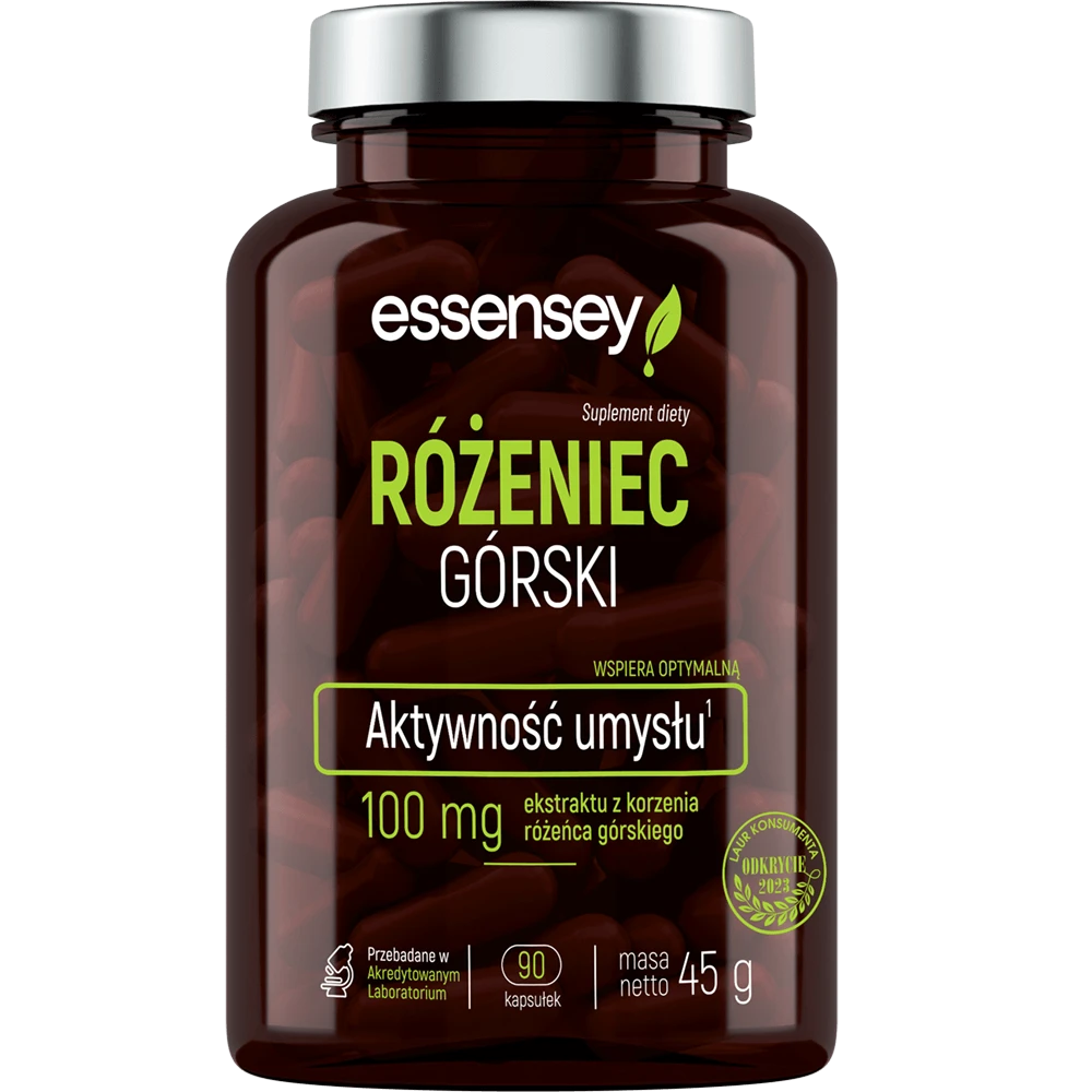 - Essensey Różeniec Górski to naturalny suplement diety wspierający koncentrację, nastrój i wydolność umysłową. Dzięki właściwościom adaptogennym pomaga organizmowi radzić sobie ze stresem, a także wzmacnia odporność.