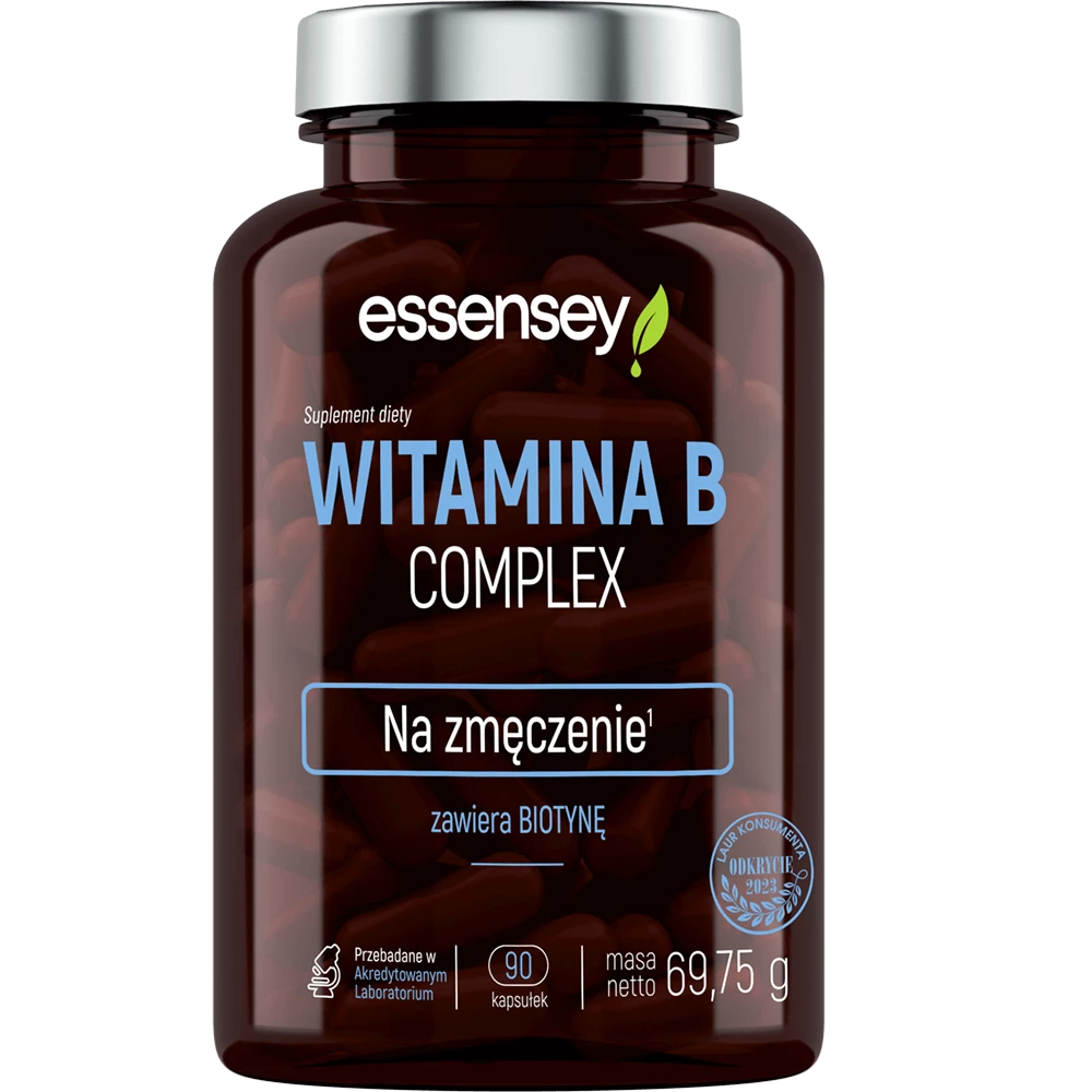 - Suplement diety ESSENSEY Witamina B Complex zawiera witaminy B6 i B12, które przyczyniają się do zmniejszenia uczucia zmęczenia i znużenia oraz do utrzymania prawidłowego metabolizmu energetycznego.