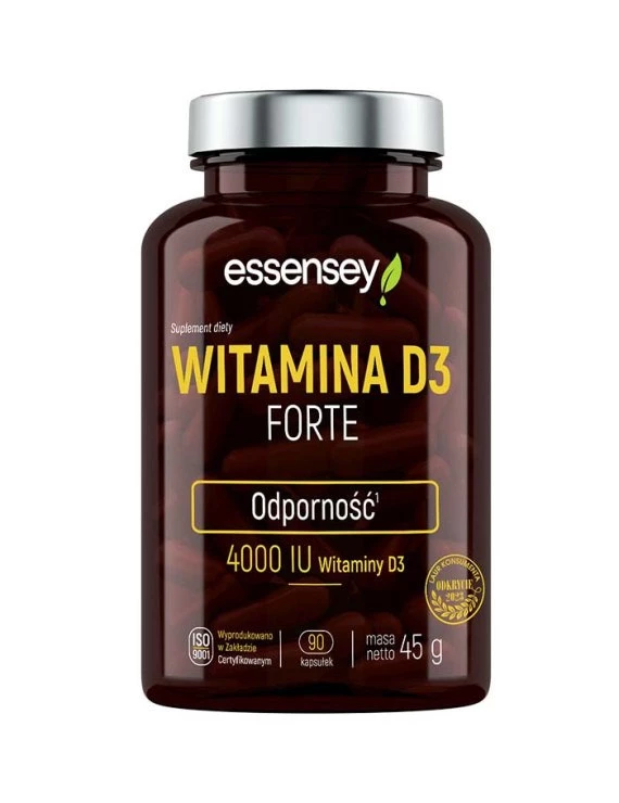 - Suplement diety Essensey Witamina D3 Forte zawiera witaminę D3, która pomaga w prawidłowym funkcjonowaniu układu odpornościowego, a także wspiera zdrowe kości, zęby i mięśnie.