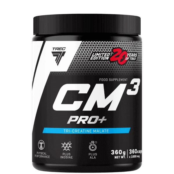 - CM3 PRO+ to zaawansowany suplement diety zawierający jabłczan trikreatyny z dodatkiem inozyny i kwasu alfa-liponowego (ALA), wspierający siłę, wytrzymałość i regenerację.