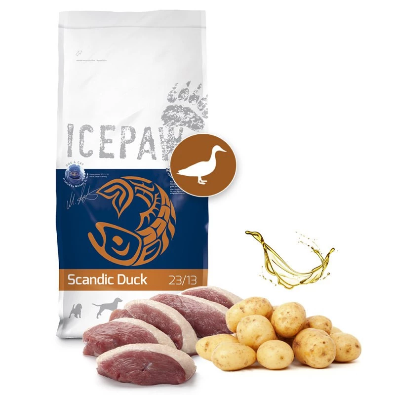ICEPAW Scandic Duck - sucha hipoalergiczna karma z kaczką dla psów dorosłych oraz z nadwrażliwością pokarmową. Bezglutenowa i bezzbożowa. Produkowana z mięsa dzikiej kaczki jako jedynego źródła białka zwierzęcego. Dzięki połączeniu z lekkostrawnymi ziemniakami ta hipoalergiczna sucha karma jest idealna dla dorosłych psów wrażliwych na pokarm. Polecana także w diecie eliminacyjnej, sprawdzania reakcji alergicznych na inne rodzaje zbóż lub źródła białka zwierzęcego. Zalecana dla psów wszystkich ras i wielkości.