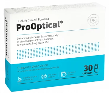 Produkt DuoLife Clinical formula ProOptical na wsparcie wzroku 30 kaps. Duolife to suplement diety. Nie może być stosowany jako substytut zróżnicowanej diety. Pamiętaj o zrównoważonym sposobie żywienia i zdrowym trybie życia.