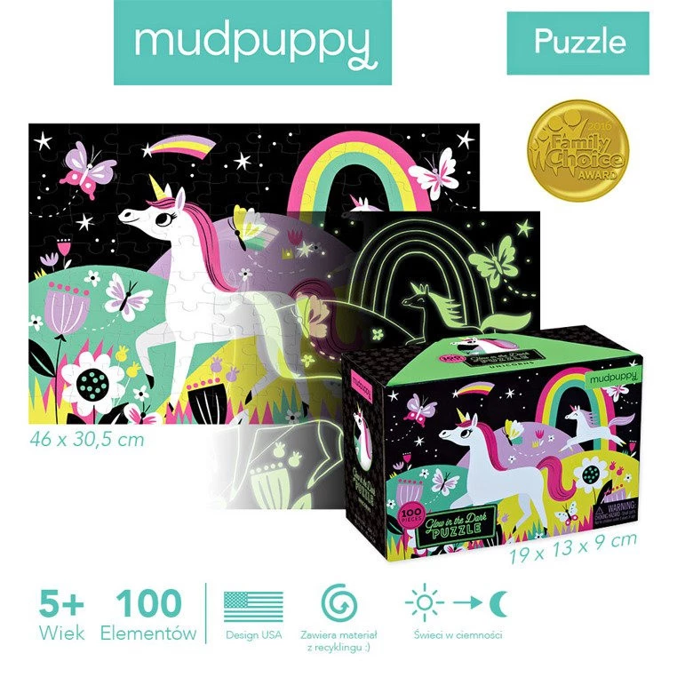 Puzzle świecące w ciemności Jednorożce amerykańskiej marki MUDPUPPY nadaje układaniu puzzli nowy wymiar – na samym złożeniu obrazka zabawa się bowiem nie kończy. Układanka składa się ze 100 elementów, po ułożeniu przedstawiających magiczny świat jednorożców. To jednak nie wszystko. Kiedy robi się ciemno kontury bajkowych stworzeń i roślin, a także gwiazdy i tęcza... świecą! Puzzle te to niebanalny pomysł na rodzinną rozrywkę. Zaciekawią i zachwycą wszystkich.
