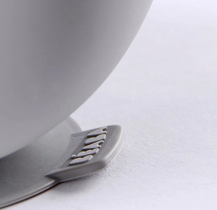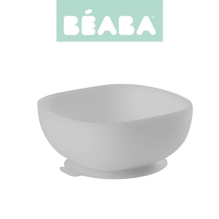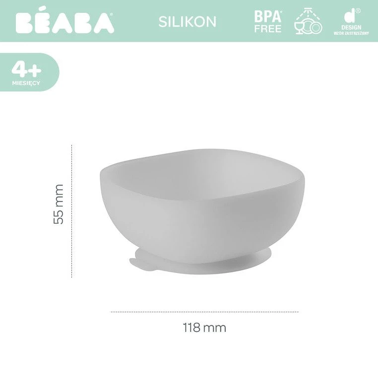 Silikonowa miseczka z przyssawką francuskiej marki BEABA posiada ergonomiczny, kwadratowy kształt z wysokimi, zaokrąglonymi po bokach brzegami, które ułatwiają dziecku samodzielne nabieranie posiłku na widelec lub łyżkę. Naczynie ma na spodzie antypoślizgową przyssawkę, dzięki czemu jest stabilne i dobrze trzyma się stołu. Miseczka ma szary kolor. Można ją myć ręcznie i w zmywarce, a także podgrzewać w mikrofalówce.