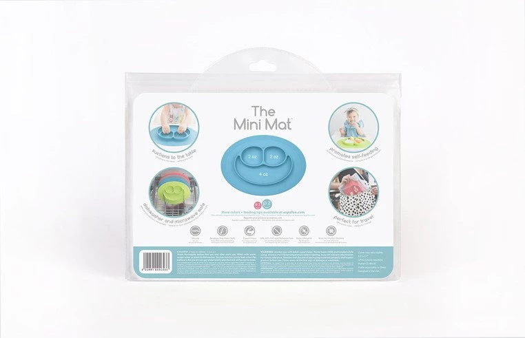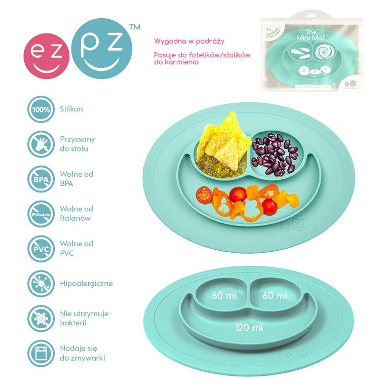 Mini Mat amerykańskiej marki EZPZ (czyt. izipizi) to nieduża, poręczna podkładka i trójdzielny talerzyk w jednym, stworzony z najbezpieczniejszego silikonu. Pasuje do większości blatów krzesełek do karmienia. Dzięki zamykanemu opakowaniu, jest to idealne rozwiązanie na podróż.