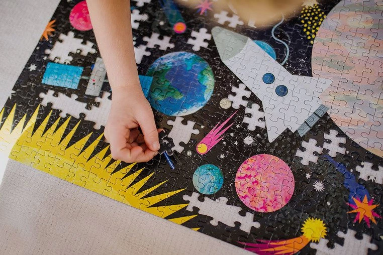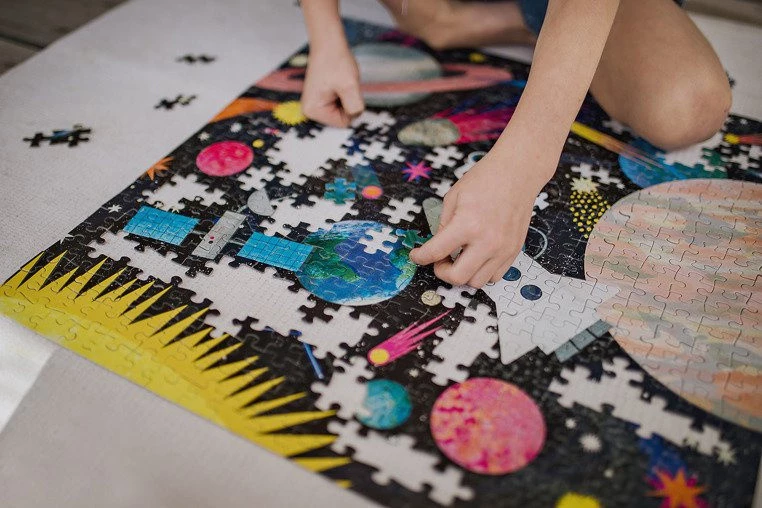 Puzzle rodzinne 500 elementów Kosmos amerykańskiej marki MUDPUPPY po ułożeniu tworzą duży i bogaty w szczegóły obraz przestrzeni kosmicznej o wymiarach 51 x 51 cm. Na tym jednak zabawa się nie kończy! Kiedy robi się ciemno, planety, gwiazdy, mgławice i inne elementy na ilustracji... świecą! Efekt ten nadaje układaniu puzzli zupełnie nowy wymiar. Te wyjątkowe puzzle zapewniają doskonałą, wciągającą rozrywkę dla całej rodziny. Autorką ilustracji jest angielska graficzka, podróżniczka i miłośniczka kolorów Natasha Durley. Puzzle zapakowane są w estetyczne pudełko. Idealnie nadają się na prezent.