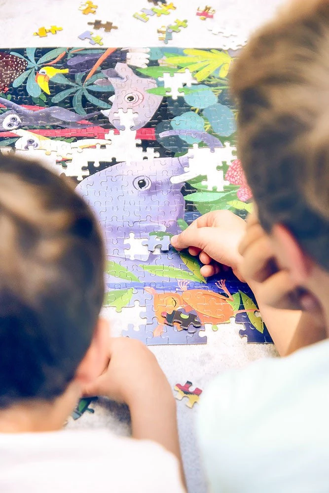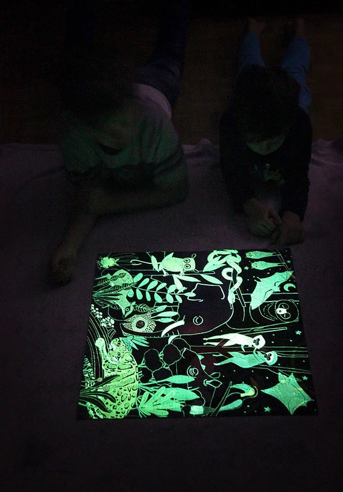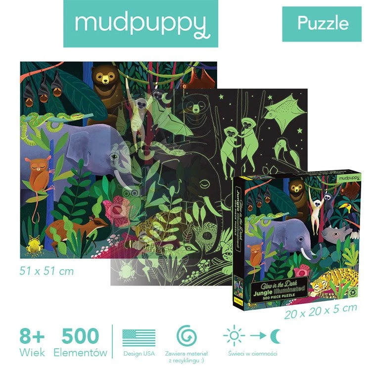 Puzzle rodzinne 500 elementów Dżungla amerykańskiej marki MUDPUPPY po ułożeniu tworzą duży i bogaty w szczegóły obraz tropikalnego lasu o wymiarach 51 x 51 cm. Na tym jednak zabawa się nie kończy! Kiedy robi się ciemno, wybrane elementy zwierząt i roślin na ilustracji... świecą! Efekt ten nadaje układaniu puzzli zupełnie nowy wymiar. Te wyjątkowe puzzle zapewniają doskonałą, wciągającą rozrywkę dla całej rodziny. Autorką ilustracji jest kalifornijska artystka, projektantka i autorka książek dla dzieci Katy Tanis. Puzzle zapakowane są w estetyczne pudełko. Idealnie nadają się na prezent.