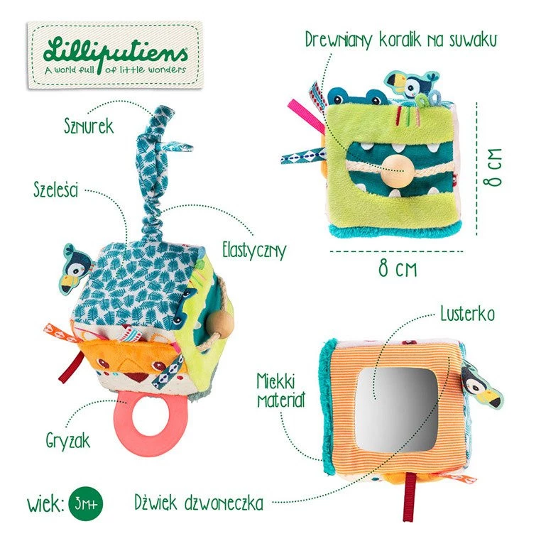 Kostka aktywizująca z kolekcji Lew Jack belgijskiej marki Lilliputiens to niebanalne, miękkie i wielofunkcyjne źródło rozrywki i nauki dla ciekawskich maluszków. Uszyta jest z materiałów o różnych wzorach i fakturach oraz posiada wiele ukrytych funkcji. Na 4 z 6 boków kostki znajdują się charakterystyczni dla marki bohaterowie: Lew Jack ma grzywę z kolorowych tasiemek, a jego jęzor to silikonowy gryzak. Krokodyl Anatol próbuje połknąć drewniany koralik, który można przesuwać po sznurku, tukan Pablo pilnuje lusterka, a lemur George robi śmieszne miny. Dwa pozostałe boki kostki są gładkie i puszyste. Kostka grzechocze przy potrząsaniu. Zabawka jest solidnie wykonana i w pełni bezpieczna. Zaskakuje i pobudza dziecięcą wyobraźnię. Rozwija koordynację ręka-oko i małą motorykę (chwytanie, potrząsanie, przesuwanie) oraz aktywizuje zmysł słuchu (grzechotanie), wzroku i dotyku, a jako gryzak – przynosi ulgę w trudnym okresie ząbkowania.