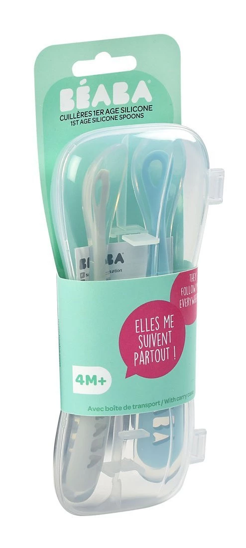 Zestaw dwóch ergonomicznych pierwszych łyżeczek dziecka francuskiej marki BEABA. Jedna w kolorze niebieskim, druga w kolorze szarym, obie z transparentnymi brzegami. Miękkie końcówki łyżeczek wykonane zostały z ultraelastycznego silikonu, w pełni bezpiecznego dla delikatnych dziąseł maluszka. Ich kształt został zaprojektowany tak, by ułatwiał malcowi przejście ze smoczka na łyżkę. Długość uchwytu sprawia, że łyżeczki nadają się również do jedzenia pokarmów ze słoiczka. Uchwyt ten jest ponadto zaprojektowany do trzymania przez dorosłe ręce, podczas karmienia dziecka. Łyżki łatwo się czyści, można je myć ręcznie lub w zmywarce.