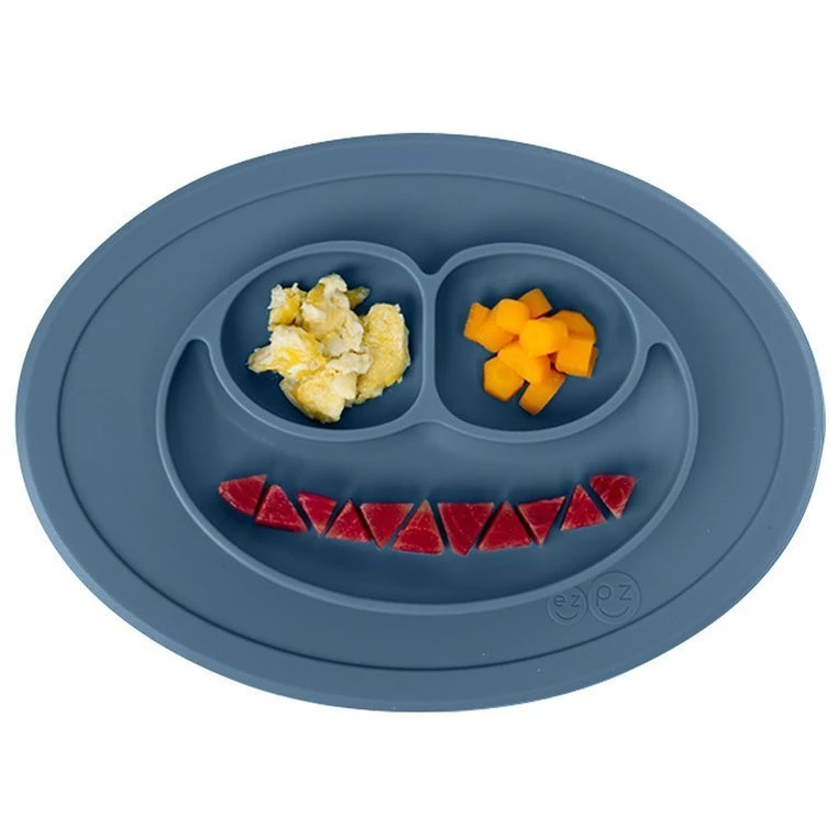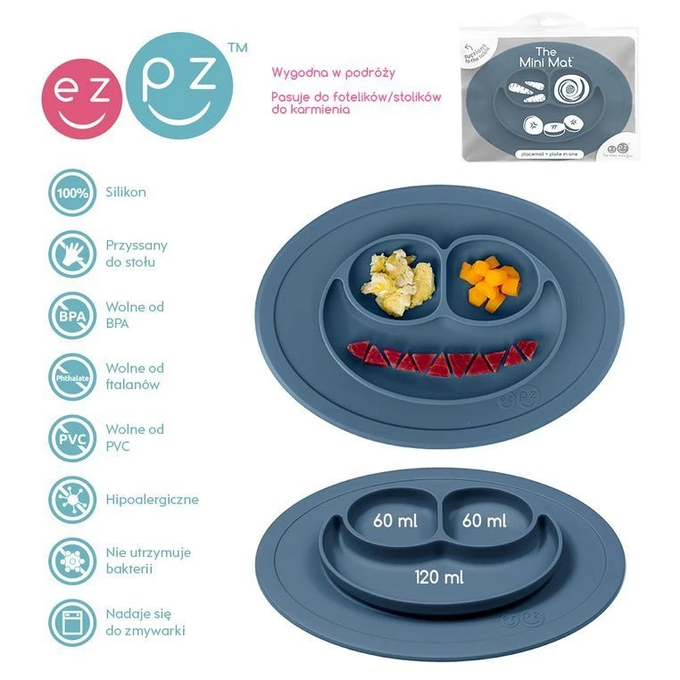 Innowacyjna silikonowa podkładka mocno przywiera do stołu czy innej gładkiej powierzchni, na której ją położysz. Dzięki temu małe dziecko nie jest w stanie jej przesunąć czy zrzucić. Ma owalny kształt, estetyczny wygląd i stylowy, ciemny, stalowoniebieski kolor. Trójdzielny talerz pozwala dzielić posiłki na porcje, co ułatwia malcowi naukę samodzielnego jedzenia, a z czasem także – rozpoznawanie kategorii pokarmów. Dodatkowo, pomaga rodzicowi podawać dania, złożone z odpowiedniej ilości różnego rodzaju składników. Pojemność talerzyka jest idealna na początkowe posiłki: 2 razy 60 ml i 120 ml. Radosny wygląd – dwie mniejsze przegródki przypominają kształtem oczy, a większa uśmiech – sprawia, że posiłki pozytywnie się maluchom kojarzą. Nadaje się do serwowania zarówno zimnych, jak i ciepłych potraw. Niewielkie rozmiary Mini Mat sprawiają, że doskonale sprawdza się na spacerze, w podróży czy w restauracji, mieści się też w większości standardowych torebek. Do maty dołączone jest ponadto opakowanie, dzięki któremu przenoszenie jej w torebce jest całkowicie higieniczne.