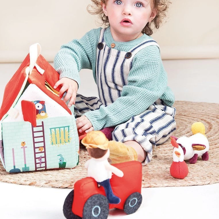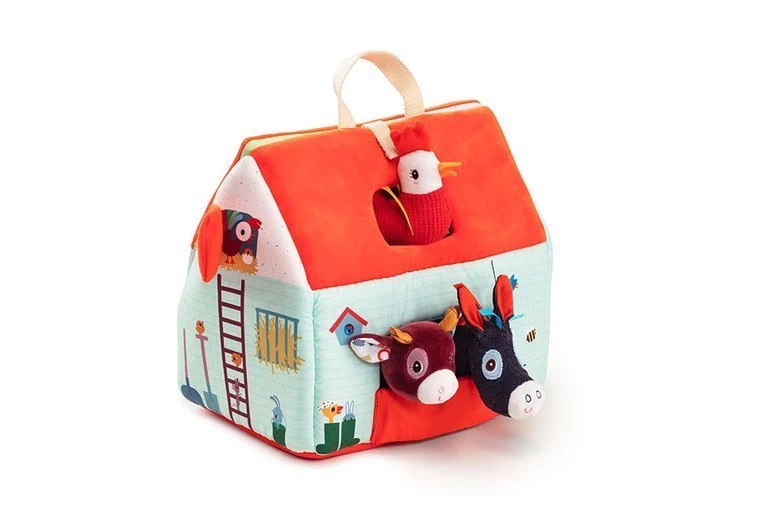 Rozkładany domek z 6 zwierzątkami, rolnikiem i traktorem z kolekcji Farma belgijskiej marki Lilliputiens to niebanalna, miękka, wieloelementowa zabawka, angażująca dziecko na wiele godzin. W skład zestawu wchodzi turkusowo - czerwony domek - farma, wąsaty rolnik Jeff, jego czerwony traktor oraz zwierzęta: krówka Rosalie, świnka Simon, owieczka Yvon, kaczor Gaston, kokoszka Paulette i osiołek Ignace. Wszystkie elementy uszyte są z materiałów o różnorodnych fakturach i wzorach. Budynek ma otwierany jeden długi bok wraz z dachem - po rozłożeniu stanowią one wiejską zagrodę z nadrukiem grządek, pastwiska, stawu czy błota dla świnki. Na drugiej długiej ścianie farmy jest otwarte okno na poddaszu i otwierane wrota do zagrody. Z boku farmy jest kurnik z ruchomymi drzwiami, a z drugiej strony są namalowane ogrodowe narzędzia i paw. Wszystkie otwierane elementy farmy maja zapięcia na rzepy, a na jej dachu znajduje się poręczny uchwyt do przenoszenia. Zabawka jest solidnie wykonana i bezpieczna. Pobudza dziecięcą wyobraźnię, zachęca do snucia opowieści, odgrywania ról i odtwarzania sytuacji, znanych z życia na wsi. Rozwija małą motorykę (chwytanie, przesuwanie, zapinanie, otwieranie), aktywizuje zmysł wzroku i dotyku, uczy gatunków zwierząt hodowlanych i rytuałów pracy na farmie.