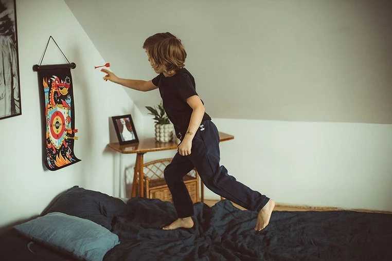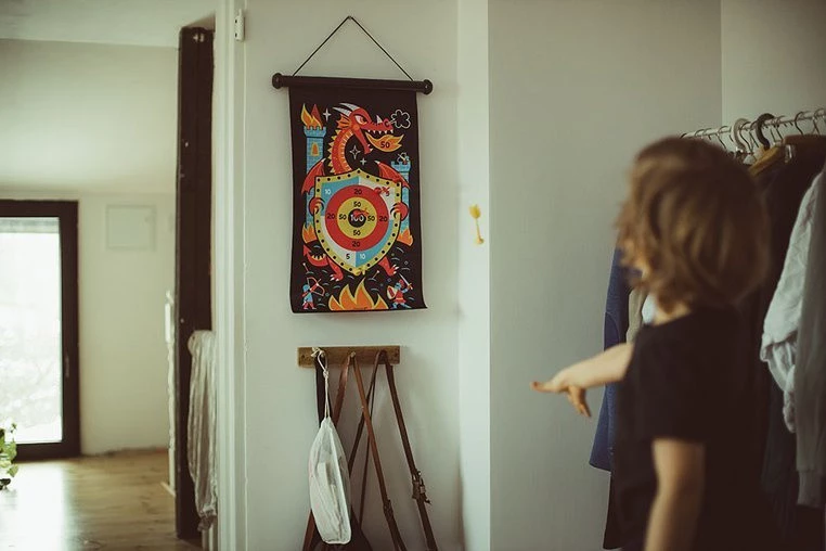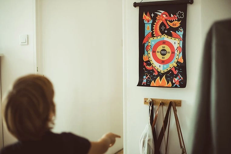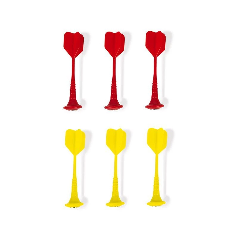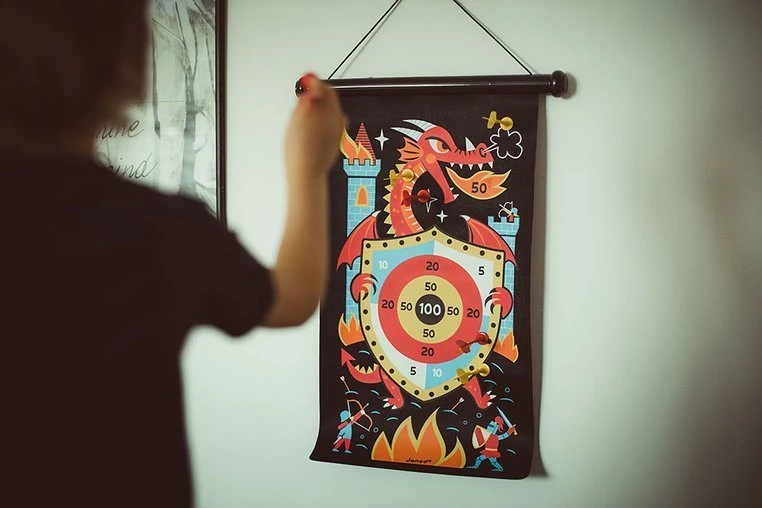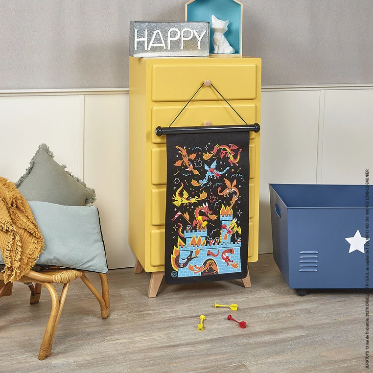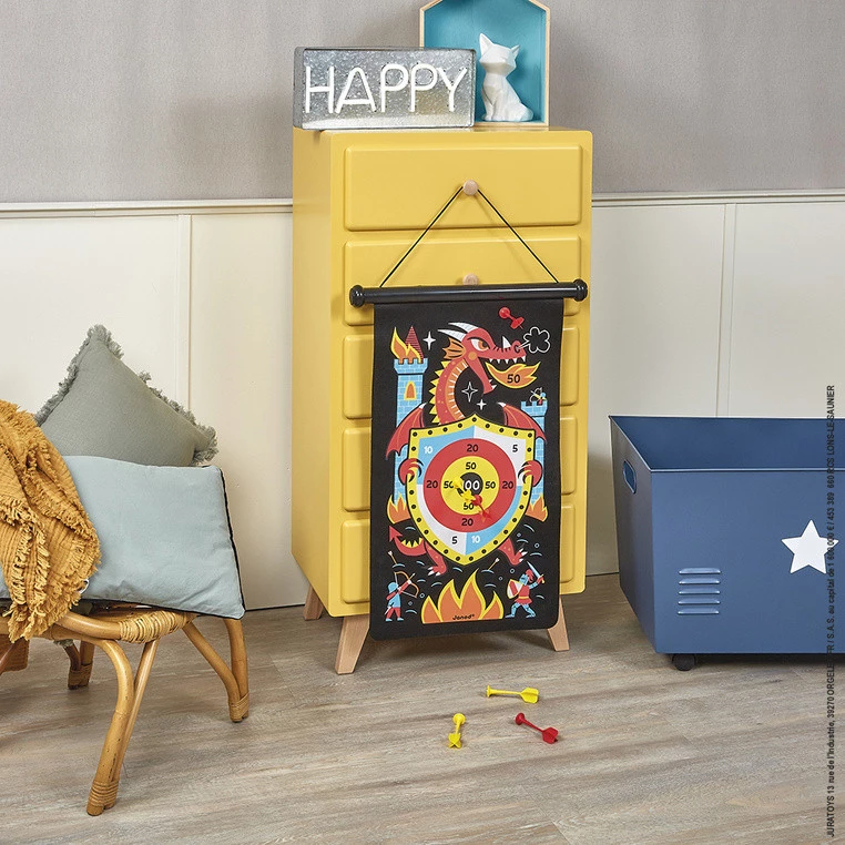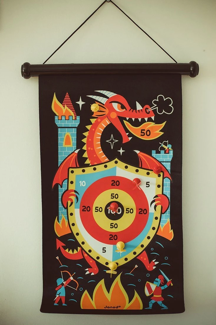Magnetyczna gra w rzutki Smoki francuskiej marki JANOD to wspaniała zabawa dla dwojga – zarówno dzieci, jak i ich rodziców. Zestaw składa się ze zwijanej na rolkę tarczy ze sznurkiem do jej zawieszenia, np. na ścianie, oraz z 6 magnetycznych rzutek w dwóch kolorach (3 czerwone i 3 żółte). Czarna tkanina tarczy ilustrowana jest dwustronnie kolorowymi motywami ziejących ogniem smoków i atakowanych przez nie rycerzy i zamków. Rzutkami należy celować w tarczę z odpowiedniej, ustalonej przez graczy odległości, w taki sposób, by trafić w oznaczone na niej punktowane miejsca. Celem gry jest zgromadzenie w trzech rzutach jak największej ilości punktów. Gracz, któremu się to uda, wygrywa. Gra ta ćwiczy koncentrację i zręczność.