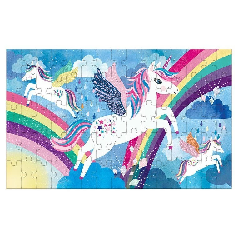 Puzzle soczewkowe Magiczne jednorożce amerykańskiej marki MUDPUPPY nadają układaniu puzzli nowy wymiar – na samym złożeniu obrazka zabawa się bowiem nie kończy. Układanka składa się z 75 elementów, które po ułożeniu tworzą obrazek o wymiarach 45 x 26 cm, przedstawiający trzy jednorożce na tęczowym niebie. Dzięki specjalnej technice druku, zwanej drukiem soczewkowym, ilustracja porusza się i „ożywa” w zależności od tego, pod jakim kątem się na nią patrzy – zmienia się nie tylko tło (posiadające efekt głębi 3D) i nasycenie kolorów, a na niebie pojawia się tęcza, ale też bohaterowie, którzy np. otwierają oczy czy poruszają skrzydłami.
