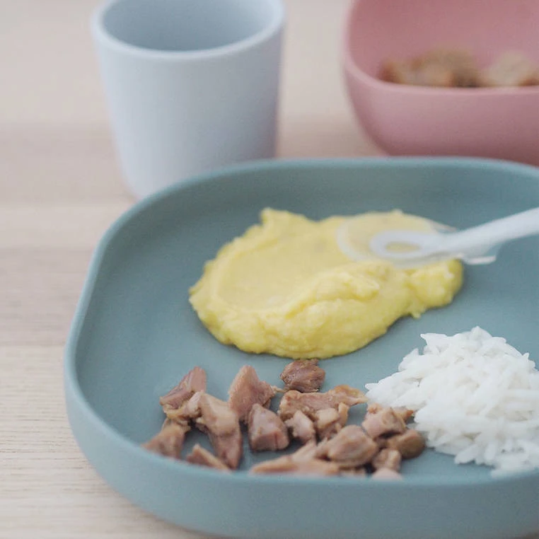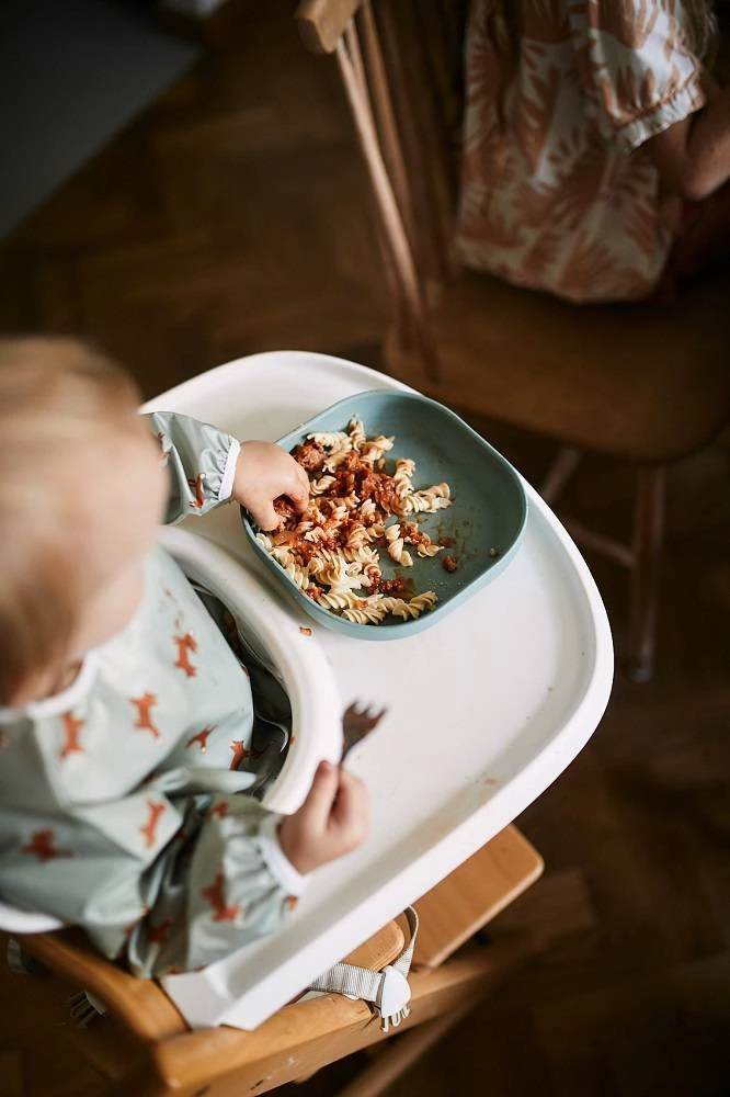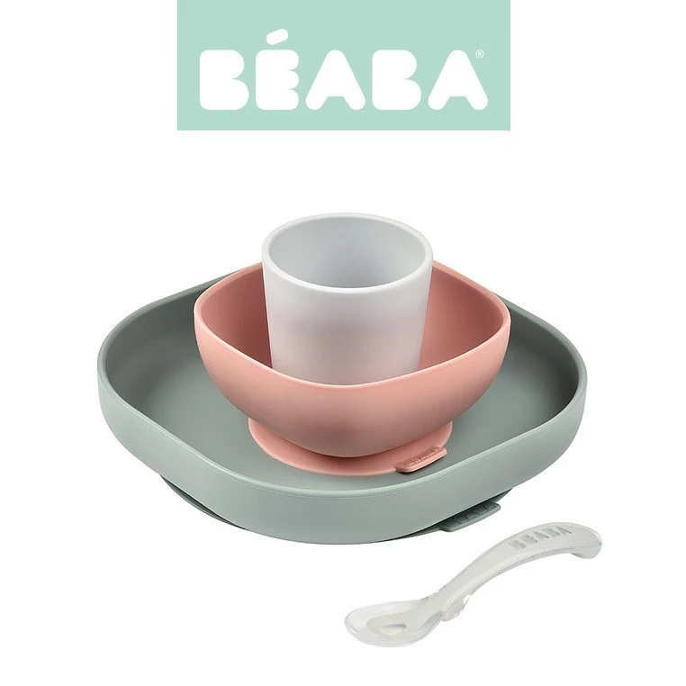 Komplet naczyń z silikonu francuskiej marki BEABA składa się z talerzyka, miseczki, kubka i łyżeczki treningowej. Wszystkie elementy zestawu charakteryzuje ergonomiczny, zaokrąglony kształt i miękkie, gładkie brzegi. Wyższe boki miseczki i talerzyka ułatwiają dziecku samodzielne nabieranie posiłku na widelec czy łyżkę. Naczynia mają na spodzie antypoślizgową przyssawkę, dzięki czemu są stabilne i dobrze trzymają się stołu. Kubeczek jest poręczny i wygodny do nauki picia, a łyżeczka idealnie pasuje do dziecięcej buzi. Łyżeczka posiada specjalną wypustkę, dzięki której można ją odłożyć tak, by jej główka nie dotykała powierzchni, dzięki czemu jej używanie jest o wiele bardziej higieniczne.