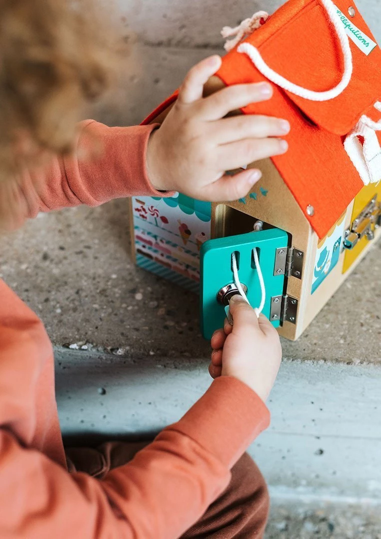 LILLIPUTIENS Drewniany domek manipulacyjny z zamkami Lisek Włamywacz 3 lata+