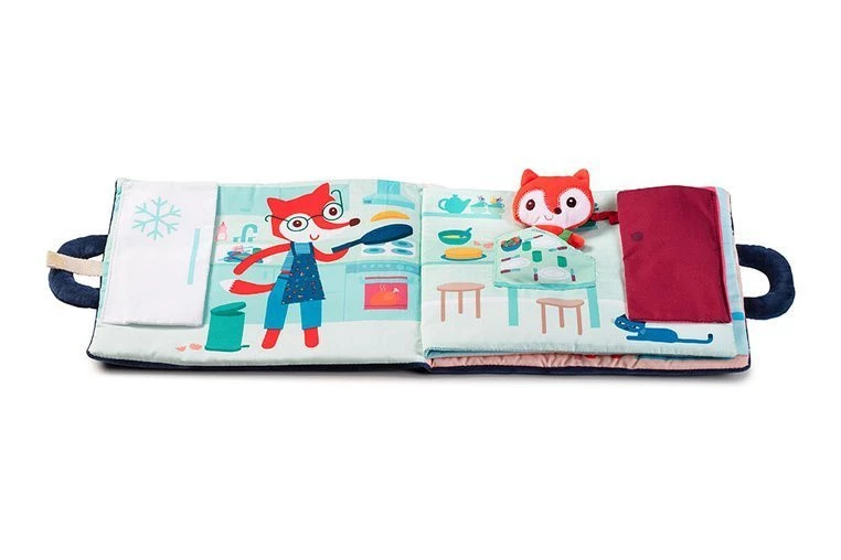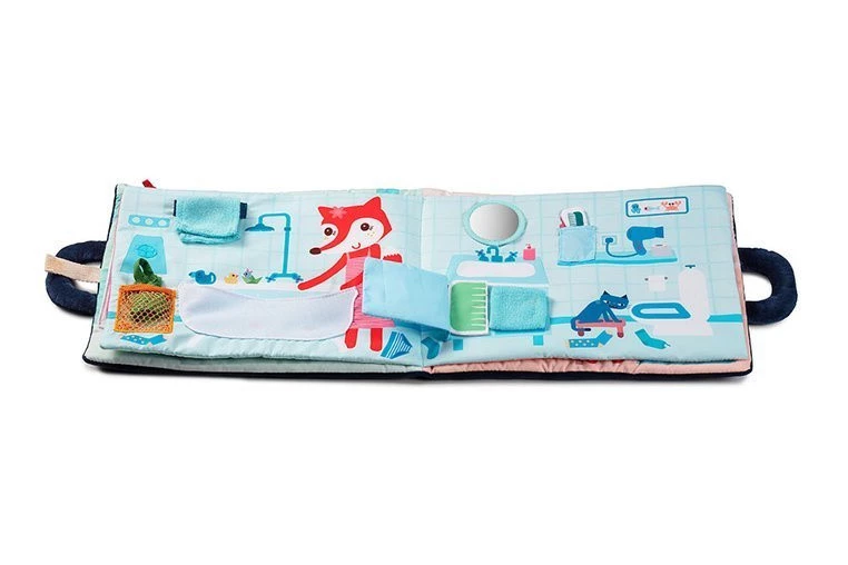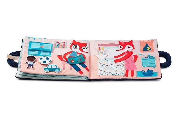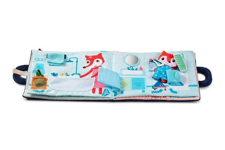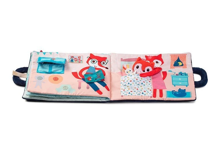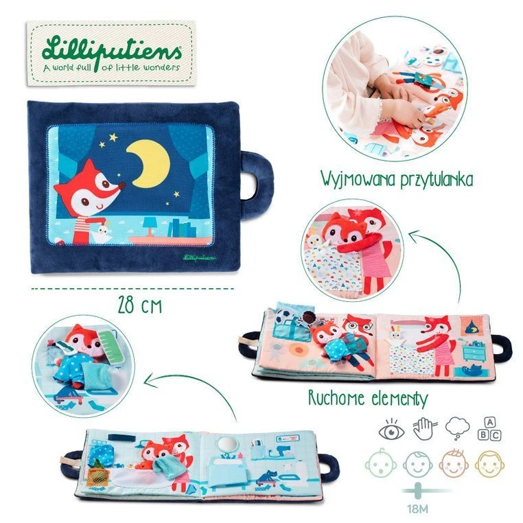 Książeczka aktywizująca „Dobranoc, mały lisku” belgijskiej marki Lilliputiens to idealna pierwsza lektura dla maluszka. Na jej okładce znajduje się lisek, patrzący na księżyc przez okno w dziecięcym pokoiku. Do książeczki dołączony jest uroczy lisek – mini-przytulanka, którego codzienne doświadczenia można śledzić i inicjować na kolejnych stronach lektury. Wykorzystując odczepiane lub odchylane elementy z różnych tkanin można snuć opowieść o wieczorze naszego bohatera – od kolacji z rodzicami, przez kąpiel i toaletę, przebieranie w piżamkę, sprzątanie zabawek, aż po czytanie i układanie do snu. Liska można m.in. karmić, np. butelką czy jabłkiem, kąpać, wycierać ręcznikiem, myć mu ząbki, zmieniać ubranie, pomagać w zbieraniu zabawek do skrzyni czy prania do kosza w łazience, sadzać za stołem, kłaść do łóżeczka itd. Wewnątrz książeczki znajdują się pomieszczenia z domu liska: kuchnia, łazienka i sypialnia. Kolorowe obrazki doskonale nadają się do snucia opowieści i łatwo zapadają w pamięć. Książeczka ma wygodne do przenoszenia rączki, jest perfekcyjnie wykończona, z dbałością o każdy szczegół i w pełni bezpieczna dla dziecka. Pobudza dziecięcą wyobraźnię i ciekawość, aktywizuje zmysły wzroku, dotyku, małą motorykę i sferę uczuciową. Jest także świetnym sposobem na zaszczepienie w maluszku miłości do książek oraz oswojenia go z wieczornymi rytuałami,