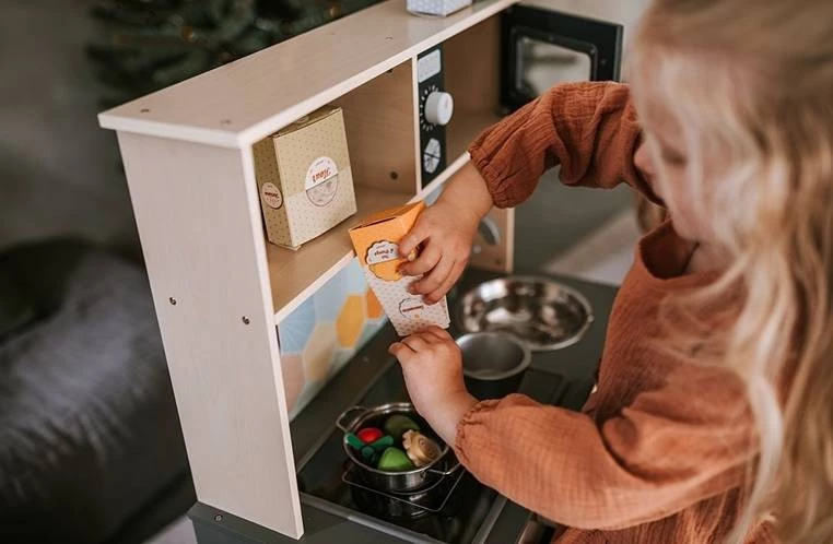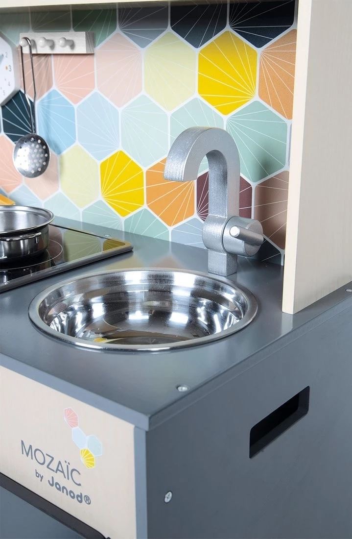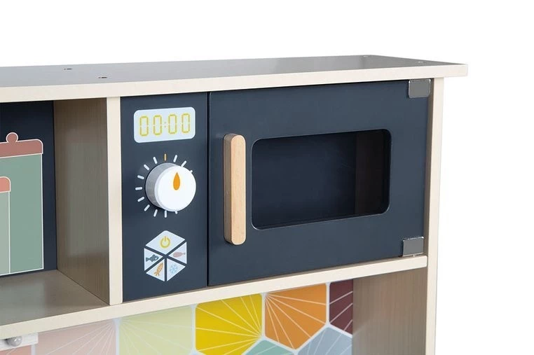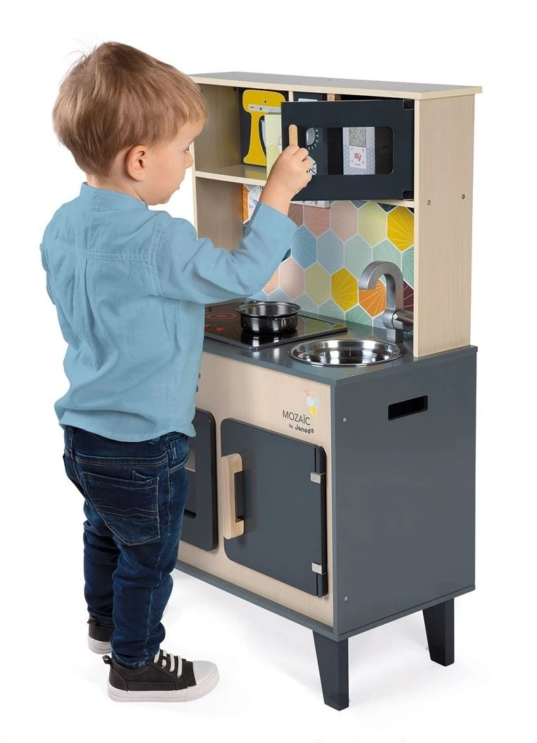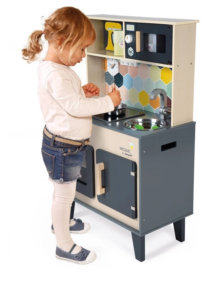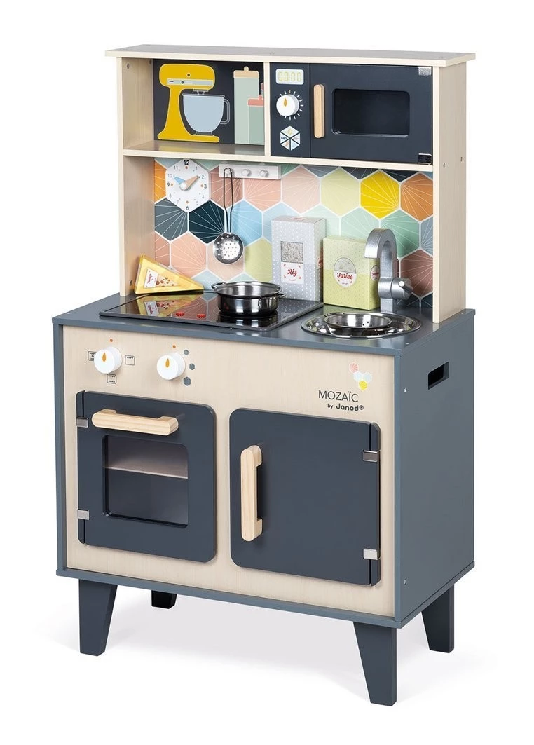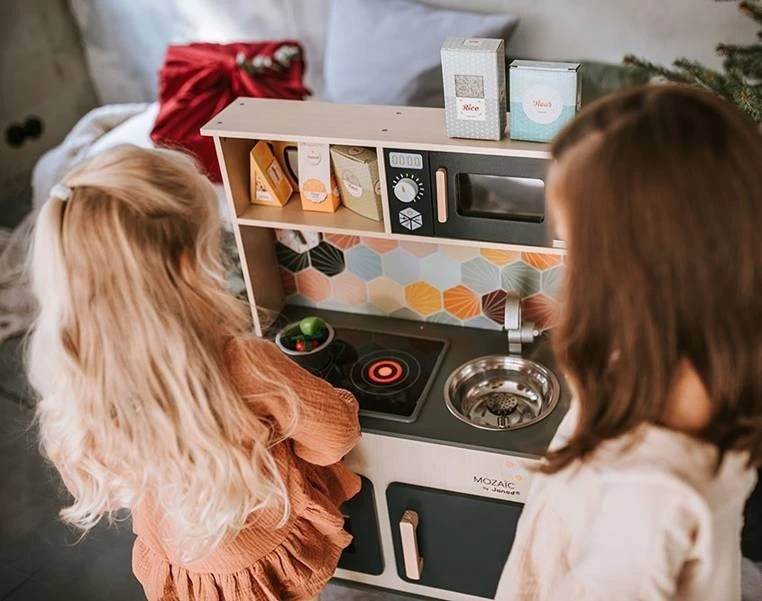 Duża drewniana kuchnia francuskiej marki JANOD sprawi mnóstwo radości każdemu dziecku, pozwoli mu bezpiecznie uczestniczyć w codziennych czynnościach, czy rozwijać pasję gotowania. W skład zestawu wchodzi przepiękny mebel w naturalnym jasnym odcieniu drewna i stylowej matowej czerni – z okrągłym metalowym zlewem (ze srebrną baterią), dwoma „elektrycznymi” palnikami, piekarnikiem i szafką z drzwiczkami na dole, a na górze – z otwartą półką (na jej plecach narysowane są pojemniki i mikser) i otwieraną mikrofalą z pokrętłem. W komplecie są ponadto akcesoria: naczynia z metalu – garnek, durszlak i łyżka do odcedzania oraz kartonowe produkty – ryż, ser i mąka. Kuchnia wyposażona jest w dwa pokrętła przy piekarniku i dwa przyciski na płycie grzewczej, sygnał dźwiękowy oraz podświetlenie typowe dla „rozgrzanych” palników (baterie nie są załączone). Na ściance ma namalowaną mozaikę z kafelków w modnym kształcie heksagonu i w pięknych, pastelowych kolorach, potrójny drewniany wieszak i zegar. Z boku zaś uchwyty, ułatwiające przenoszenie zabawki. Dzięki sporym rozmiarom i akcesoriom może się nią bawić jednocześnie więcej niż jedno dziecko.