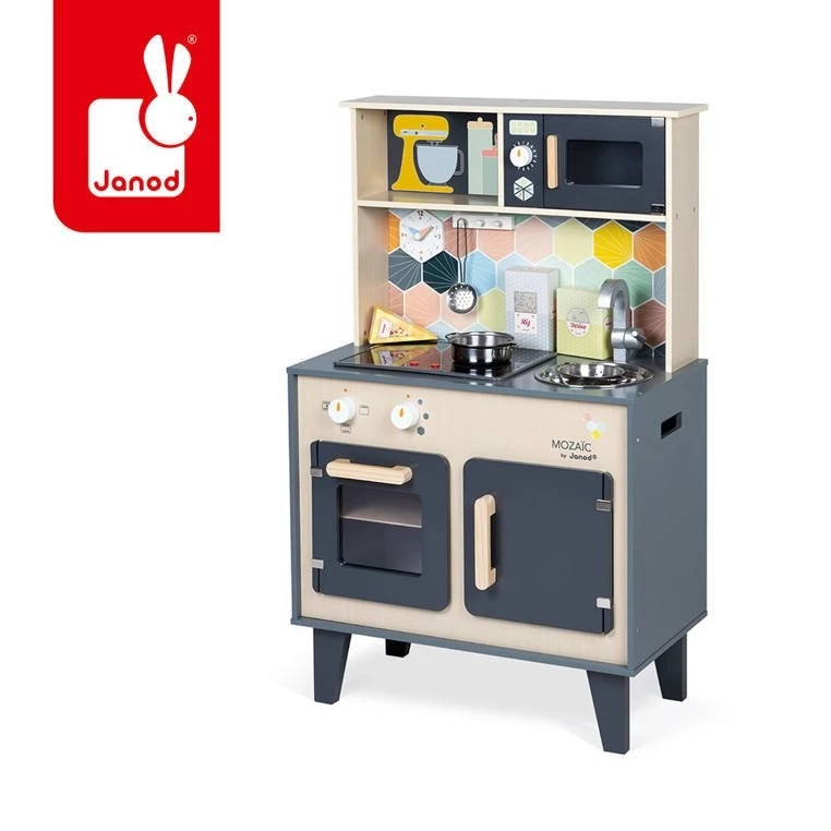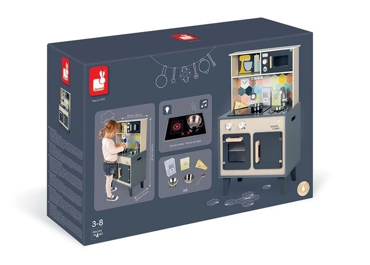Janod Duża drewniana kuchnia z dźwiękiem, światłem LED i 6 akcesoriami Mozaika 3-8 lat