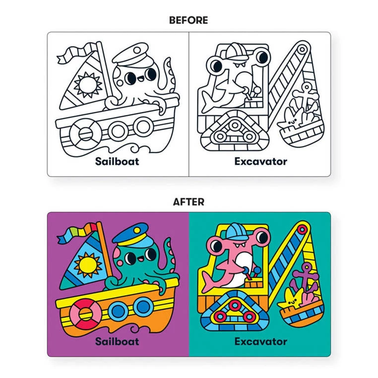 Niezwykła książeczka do kąpieli Ruch pod wodą amerykańskiej marki MUDPUPPY, wykonana z miękkiego, łatwego do czyszczenia i szybkoschnącego materiału. Na każdej z 6 stron znajduje się morskie stworzenie w oryginalnym pojeździe, np. ryba-młot sterująca koparką, rodzina żółwików w surferskim vanie czy ośmiornica, kierująca wywrotką. Książeczka posiada „magiczne” właściwości – po zanurzeniu w wodzie na czarno-białych ilustracjach pojawiają się kolory! Zabawka zachwyca, zaskakuje i rozbudza wyobraźnię. Idealnie nadaje się na prezent.