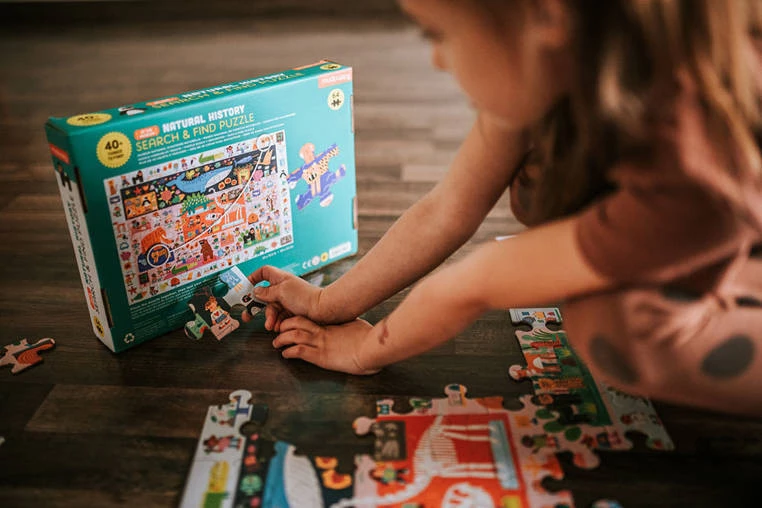 Puzzle obserwacyjne Muzeum historii naturalnej amerykańskiej marki MUDPUPPY nadają układaniu nowy wymiar – na samym złożeniu obrazka zabawa się bowiem nie kończy. Układanka o wymiarach 59 x 39 cm składa się z 64 elementów. Po ułożeniu przedstawia salę w muzeum historii naturalnej, z eksponatami przyrodniczymi na stanowiskach i w gablotach oraz tłumy zwiedzających wystawę osób. To jednak nie wszystko! Na kontrastowym pasku wokół ilustracji znajduje się ponad 40 różnych elementów, które należy odszukać na obrazku, m.in. ryby, żółw, dinozaur, wulkan, rozgwiazda, pani w białym kitlu, dziewczynka z zeszytem czy dziewczynka na wózku inwalidzkim, co dodatkowo uatrakcyjnia układanie i trenuje spostrzegawczość. Wyjątkowy design i przyjazne barwy dodatkowo zachęcają do zabawy. Zapakowane są w estetyczne pudełko. Idealnie nadają się na prezent.